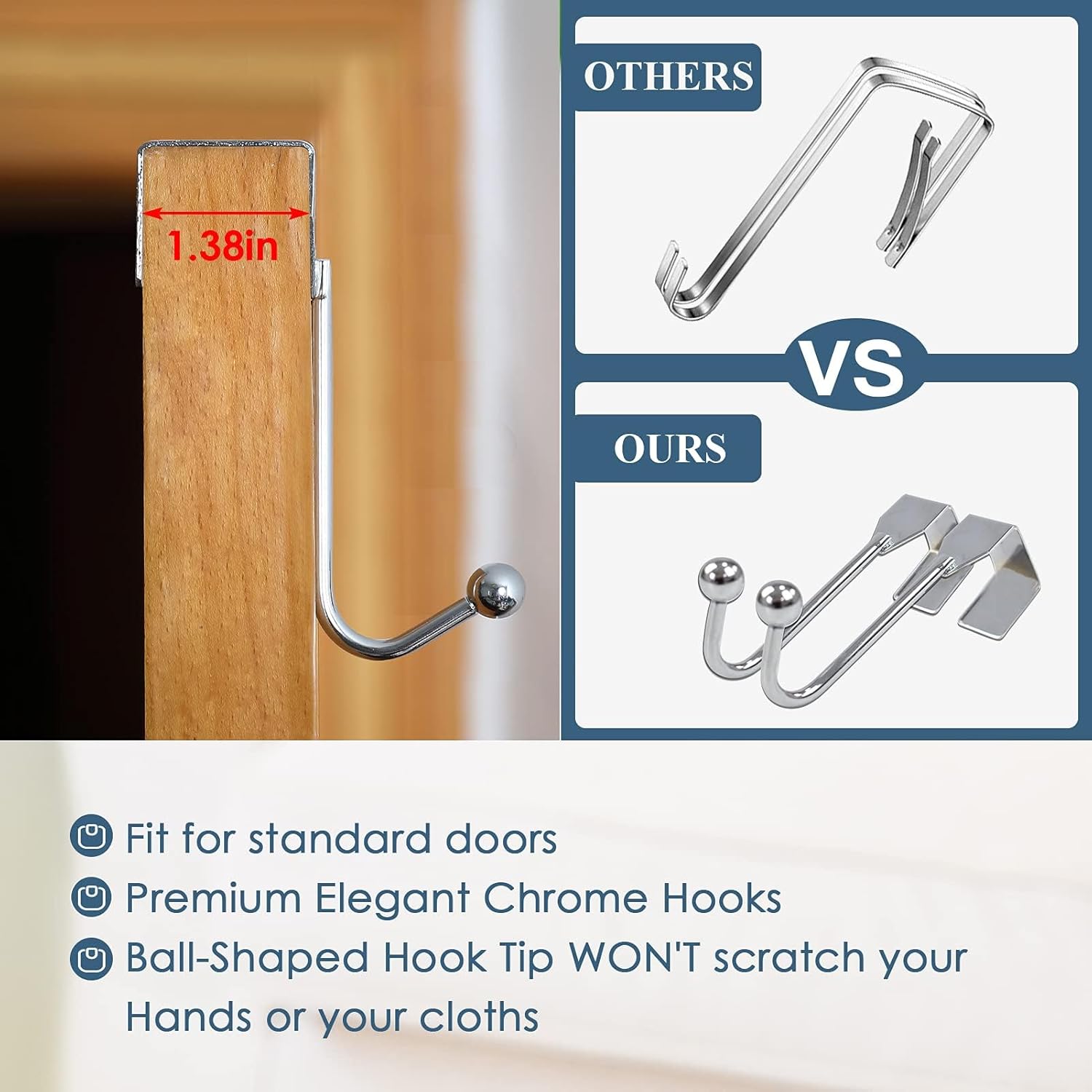 - 2 Wide Metal Hooks & Adhesive- The 1.38โ wide over-door hooks are specially designed with BALL-SHAPED HOOK TIPS to avoid scratching clothes or fingers. Premium THICKNESS & WIDTH ensure the hooks hang stably on the door. They never deform, slide out of place, or scratch your door easily like those cheaper hooks. Two damage-free adhesives are included for your use.