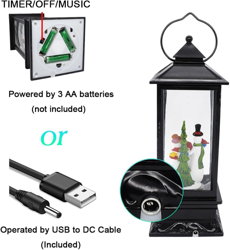 - ★WHAT YOU WILL GET: You will get 1 pcs Musical Water Snow Globe Lantern in black color finish, which can be operated by USB cord (included) or 3 AA batteries( not included). Product dimension is 4" x 4" x 12"