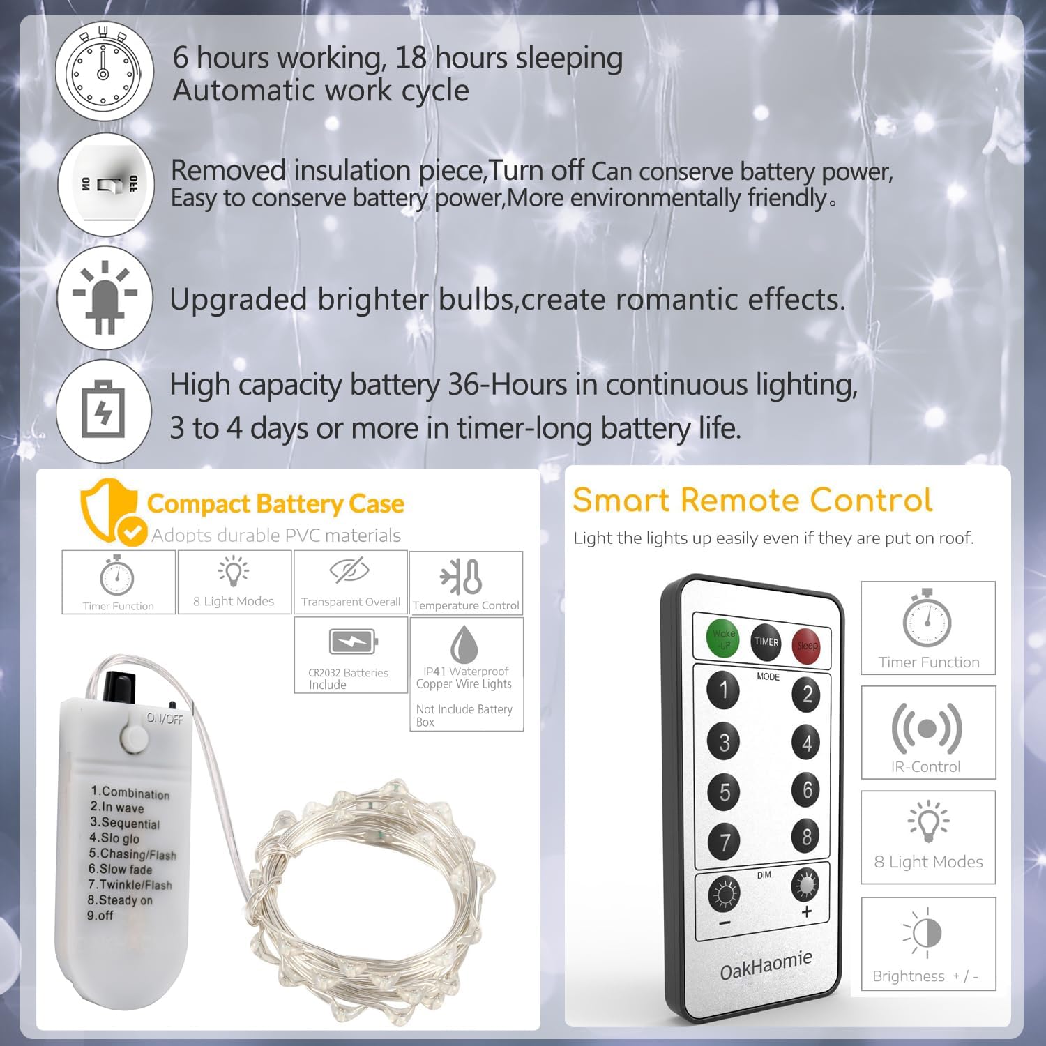 - ăRemote Control Fairy lightsă-OakHaomie fairy lights comes with 2pcs remote controllers.Except the basic remote switch function,it also can change lighting mode, brightness adjustment and timing functions. Press the timer button, the light off automatical after 6 hours, and switches it back on at the same time next day,In terms of brightness, The factory default brightness level is set to 50%,from soft to bright, the brightness can be adjusted ; 8 lighting modes lights is suitable for everyday decorations and holiday decorations, the soft lighting will add a delicate and setting off a warm and comfortable atmosphere..