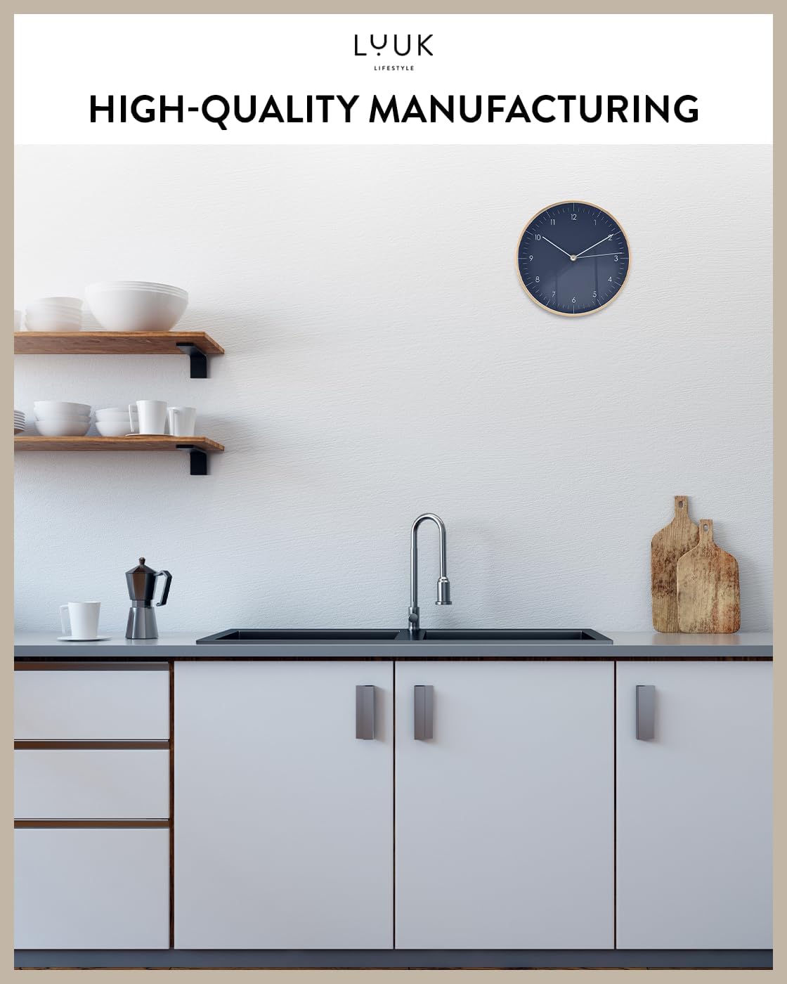- A STYLE THAT FITS IN WITH ALL INTERIOR STYLES: Our wall clock is suitable for all types of interiors and layouts (as a living room clock, kitchen, hallway, office, bathroom, children's room, etc.) and blends in perfectly with your furniture