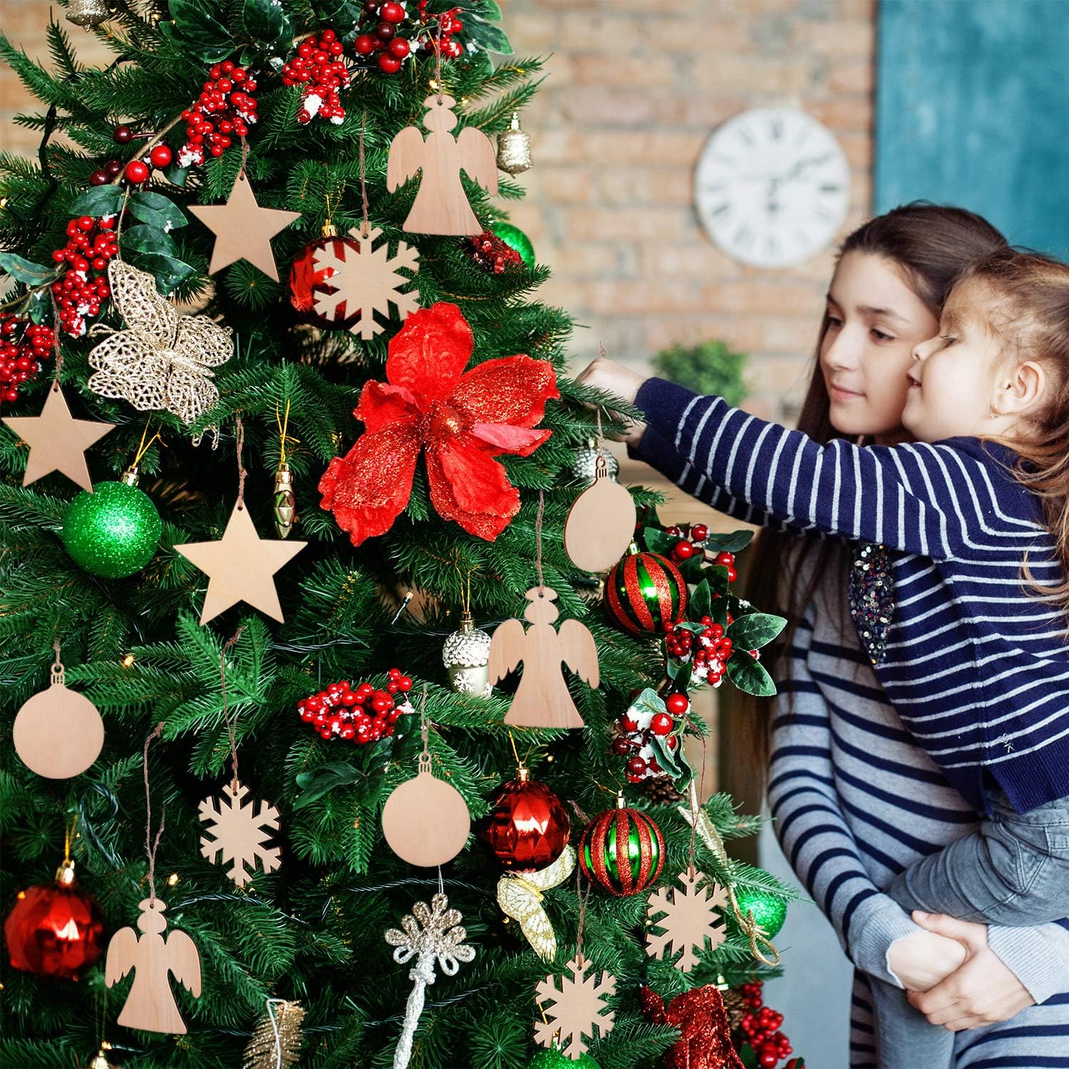 Blulu 60 Pieces Christmas Wooden Ornaments Round Wood Slices Snowflake Angel Shape with Cords for DIY Crafts New Year Christmas Tree Pendant Ornaments