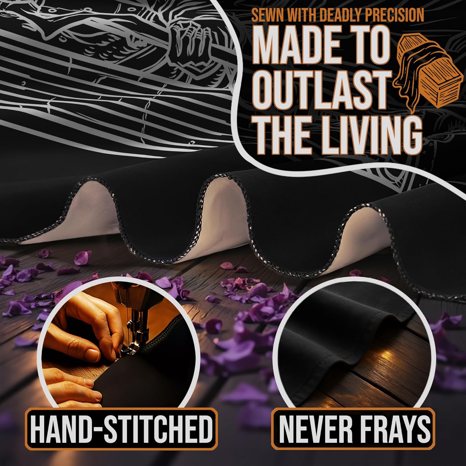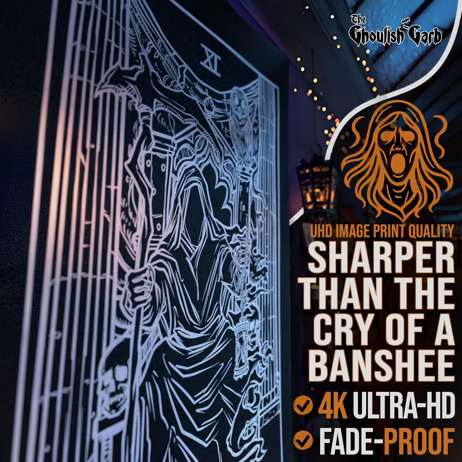 The Ghoulish Garb Justice Tarot Card Tapestry (Black & White) - Grim Reaper - Gothic Halloween Home Decor Wall Hanging (80" x 68")