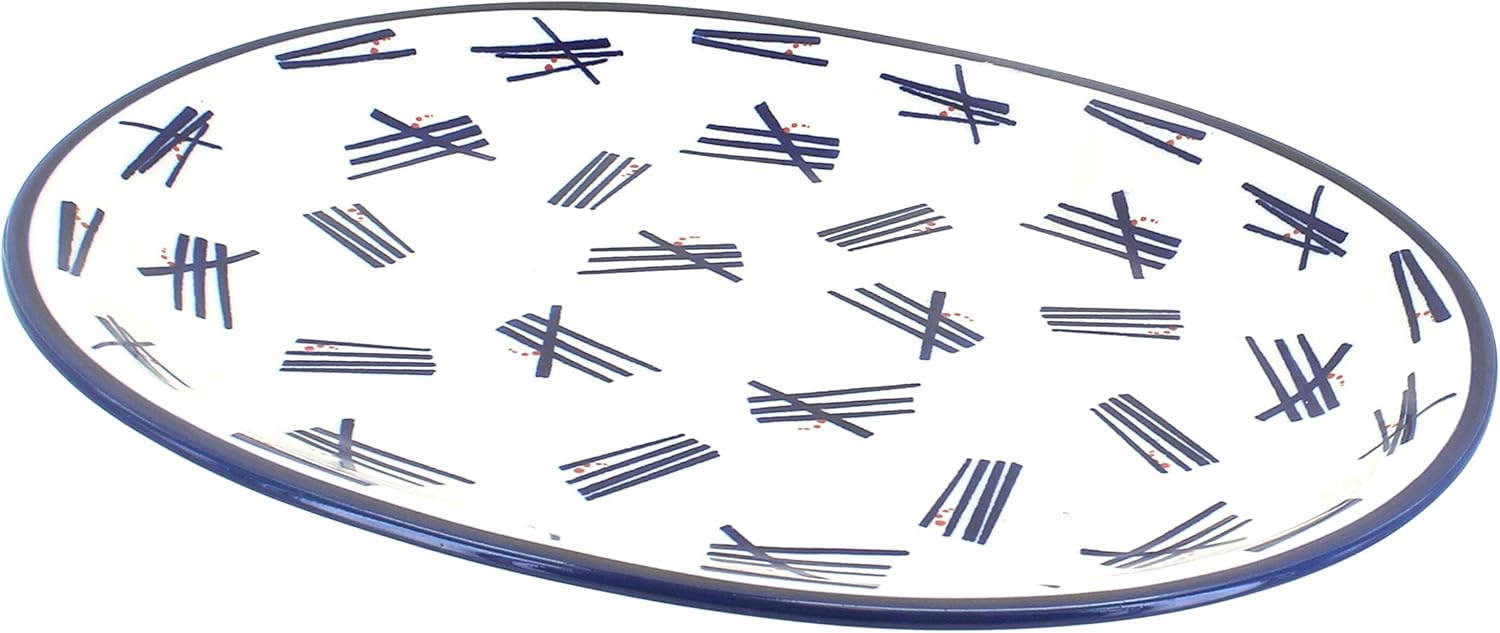 - Each one of our serving platters is shaped and decorated by hand, while glazed and high fired to long-lasting quality. Choose the size and pattern to fit your personal tastes. 13.5” x 10.5” x 1.25”.
