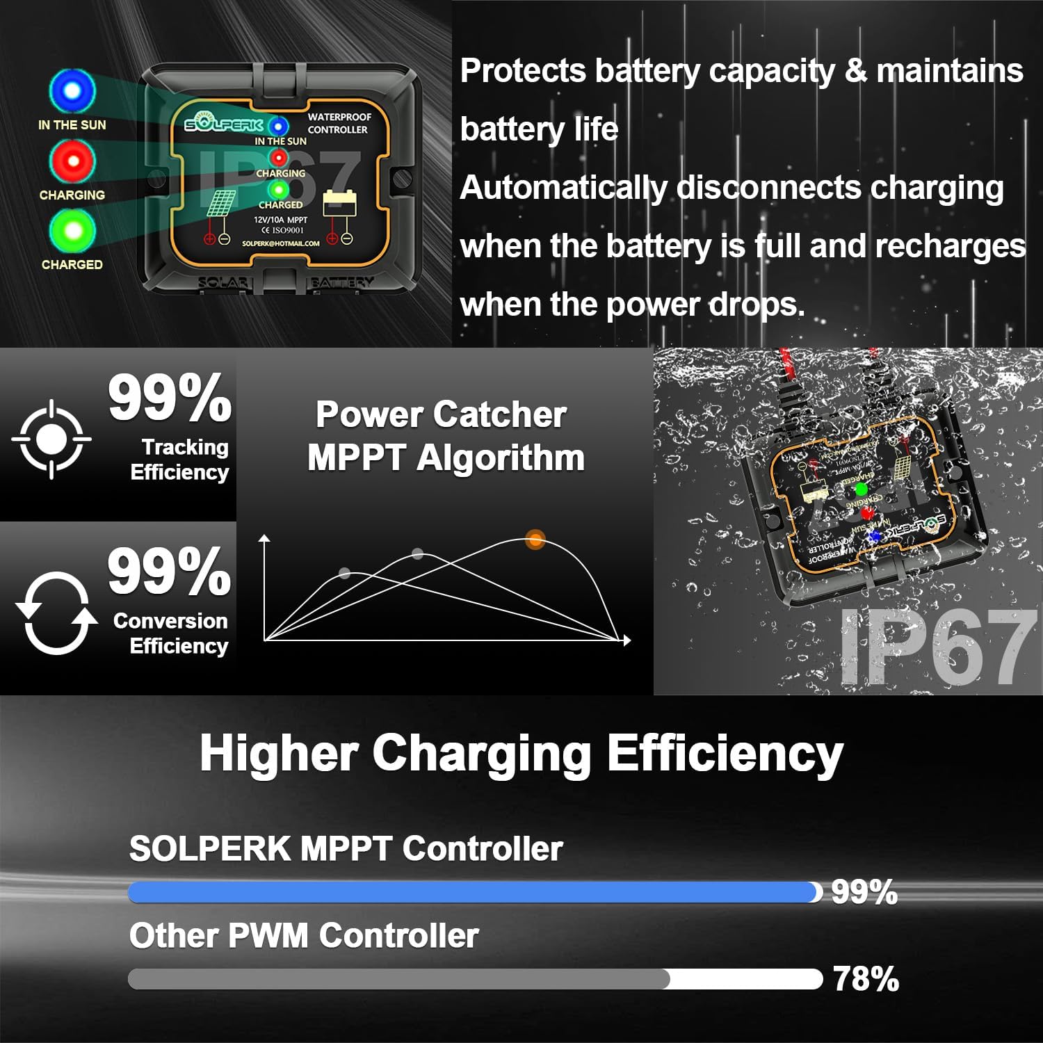 - 【Smart Charge Controller】The charging efficiency of this upgraded 8A controller is 20%-30% higher than other controllers on the market. Its intelligent three-stage charging design effectively prevents the battery from overcharging, over-voltage and short circuit. It takes no power from the battery. You will clearly know the charging status of the battery through the two indicator lights on the controller