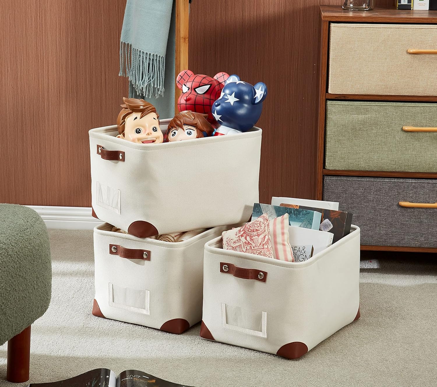 - Label & Organize: This basket features a label holder to help you find items without pulling out the bins each time. The luxurious canvas exterior fabric, faux leather handles and corner feet are designed for a modern and elegant feel.