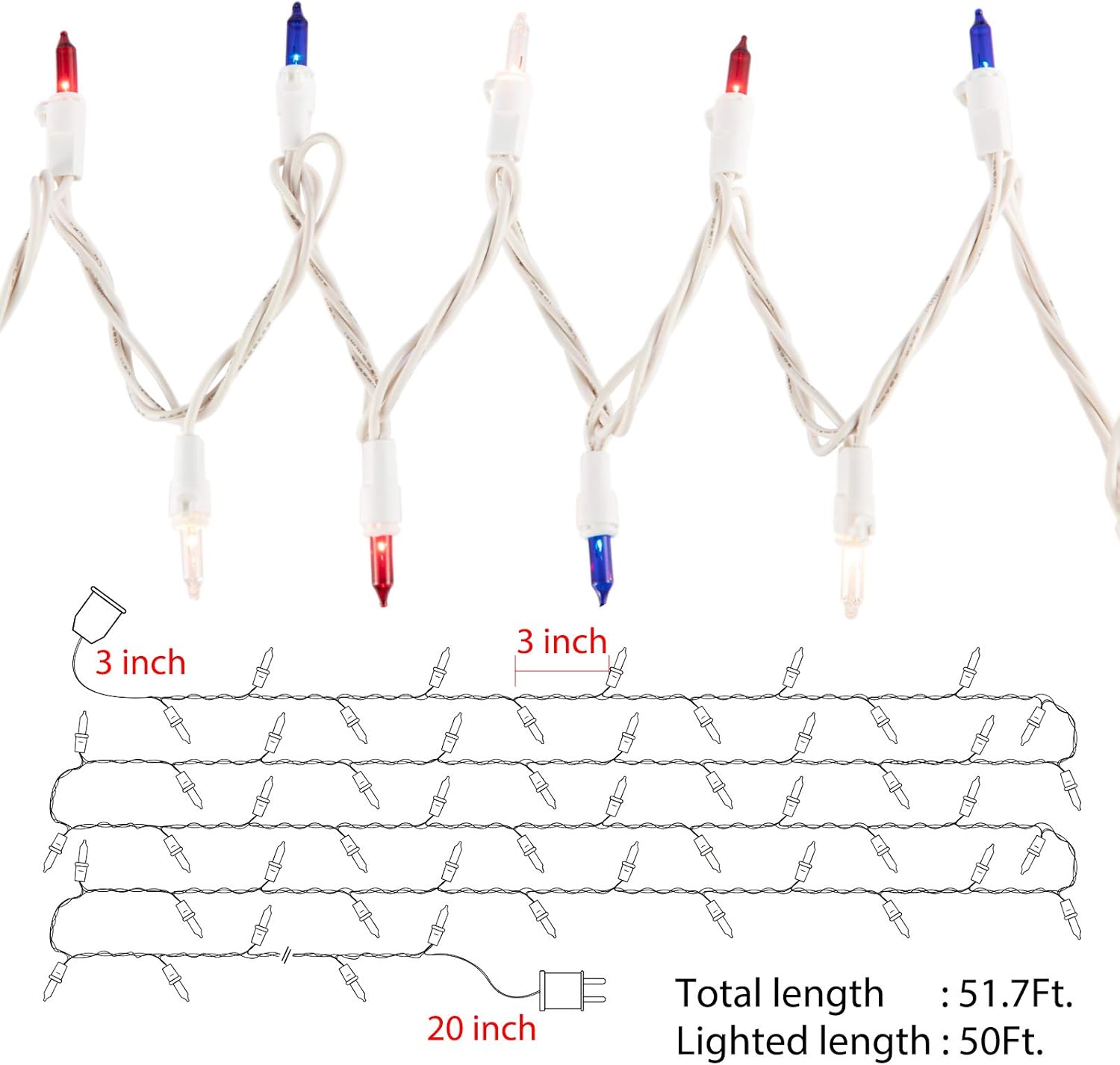 - Creative Patriotic Decorations: This Independence Day Decorations light on white wire set includes 200 incandescent mini bulbs. The total length is 53 feet, each bulb is 3 inches apart, 20 inches lead wire, 3 inches end connector. It can be connected end to end to meet your decoration needs, up to 5 creative light strings