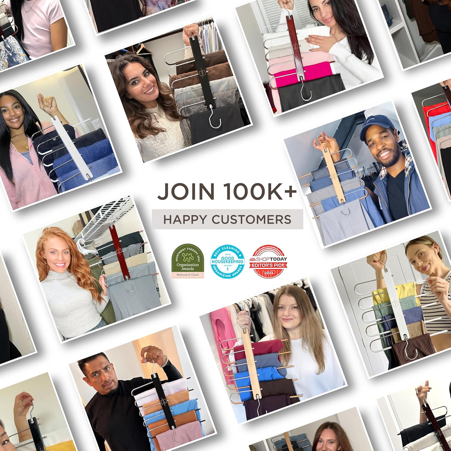 - Enjoy More Closet Space - Clean up closet space with a clothes hangers space saving wardrobe organizer that's unlike other pants hangers for men and women. Your multi hanger set can be a slack hangers, a jeans organizer for closets, skirt organizer hangers, trouser hangers, or scarf organizer giving you a complete multifunctional pants rack