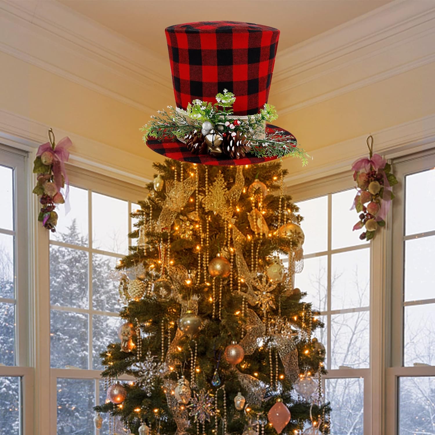Prsildan Christmas Plaid Top Hat Tree Topper with Pine Cones, Berries, and Bells - Holiday Decor