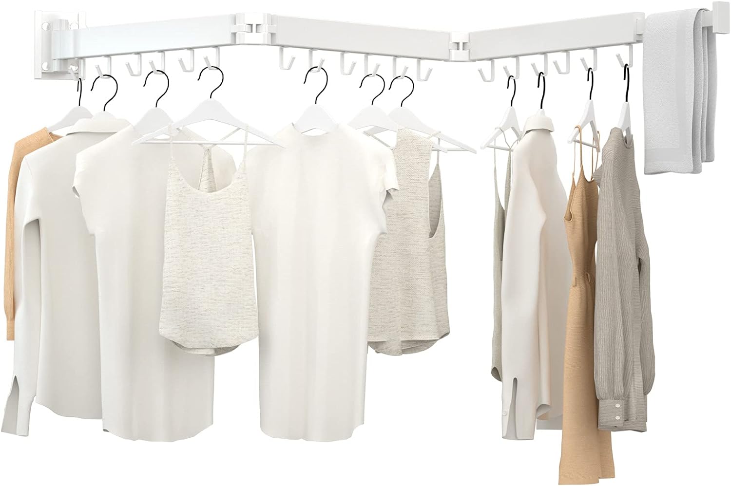- ✅ Flexible & Space Saving Design -- This innovative clothes drying rack wall mounted can swing 180 ° to the left and right, allowing you to maximize your drying space. Also includes 12 hooks that can rotate 360° and a hidden telescopic rod. When not in use, simply fold down to a compact size to keep your area clutter-free