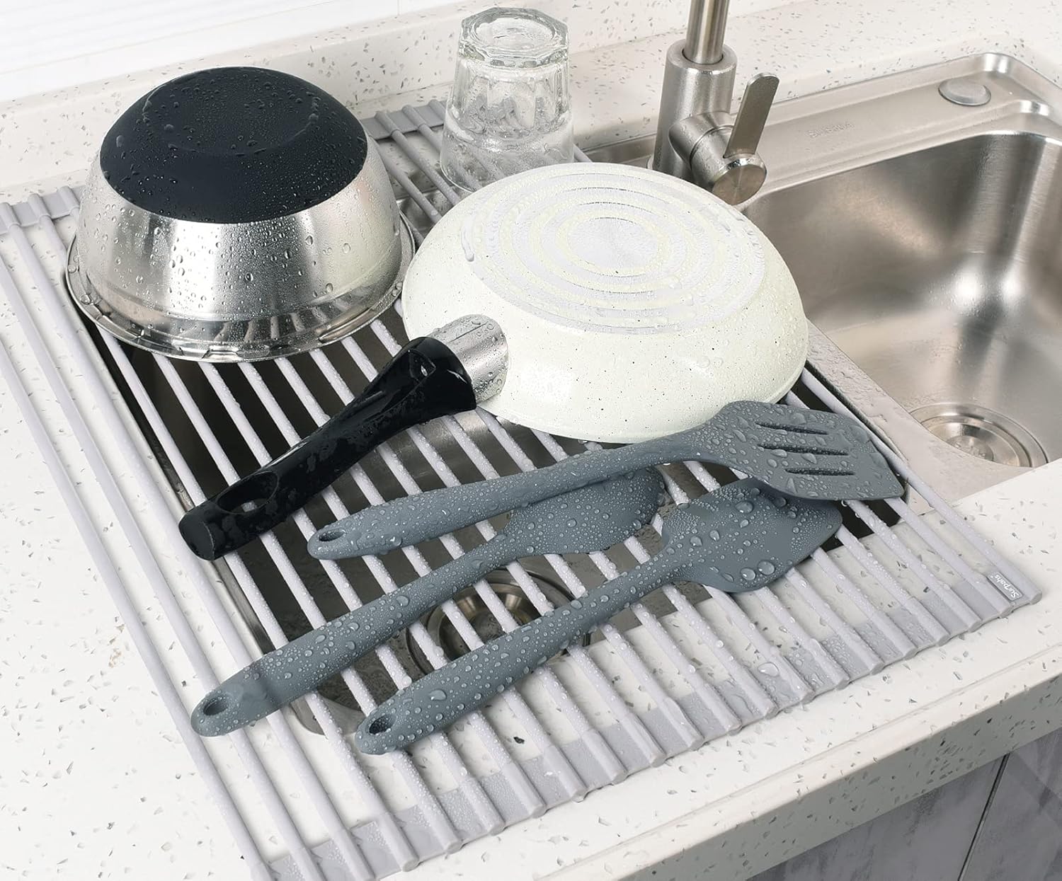 Surpahs Over Sink Foldable Multipurpose Roll-Up Dish Drying Rack, Silicone Wrapped Stainless Steel, Warm Gray, 20.5" x 15.5"