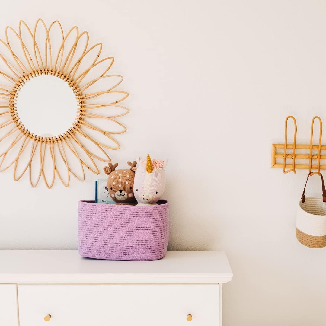 - Premium Cotton Rope Weave – These beautiful rainbow toy baskets are woven with high-quality, all-natural cotton to give them the right balance of softness and durability. This makes them great for bedrooms, nurseries, and laundry rooms as rainbow room decor.
