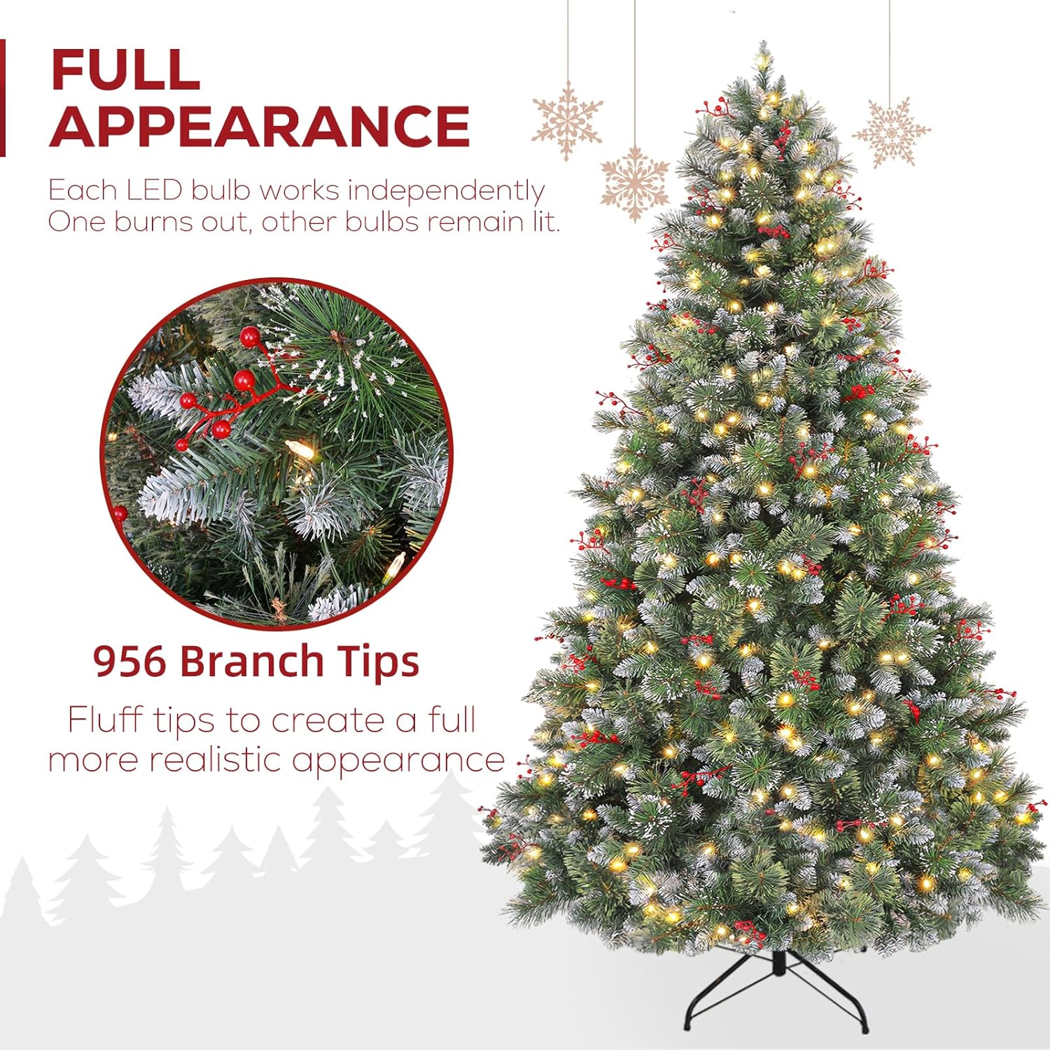 - Natural & Lush Look:​​ Experience a luxuriously full 6ft Christmas tree adorned with 956 PVC branch tips and realistic red berries. Snow-dusted pine needles create an enchanting wintry charm, while hassle-free assembly and ample decoration space ensure effortless elegance.