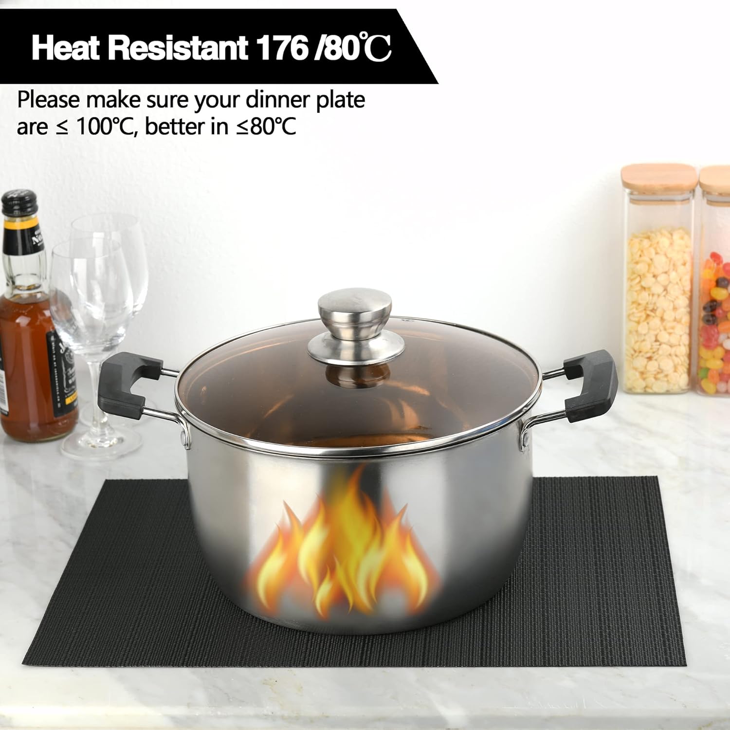 - Heat Resistant: Please make sure your dinner plate are β€ 100β, better in β€80β. It can prevent the table from slipping and scalding the countertop. These beautiful stylish vinyl place mats to add more fun to your dining table