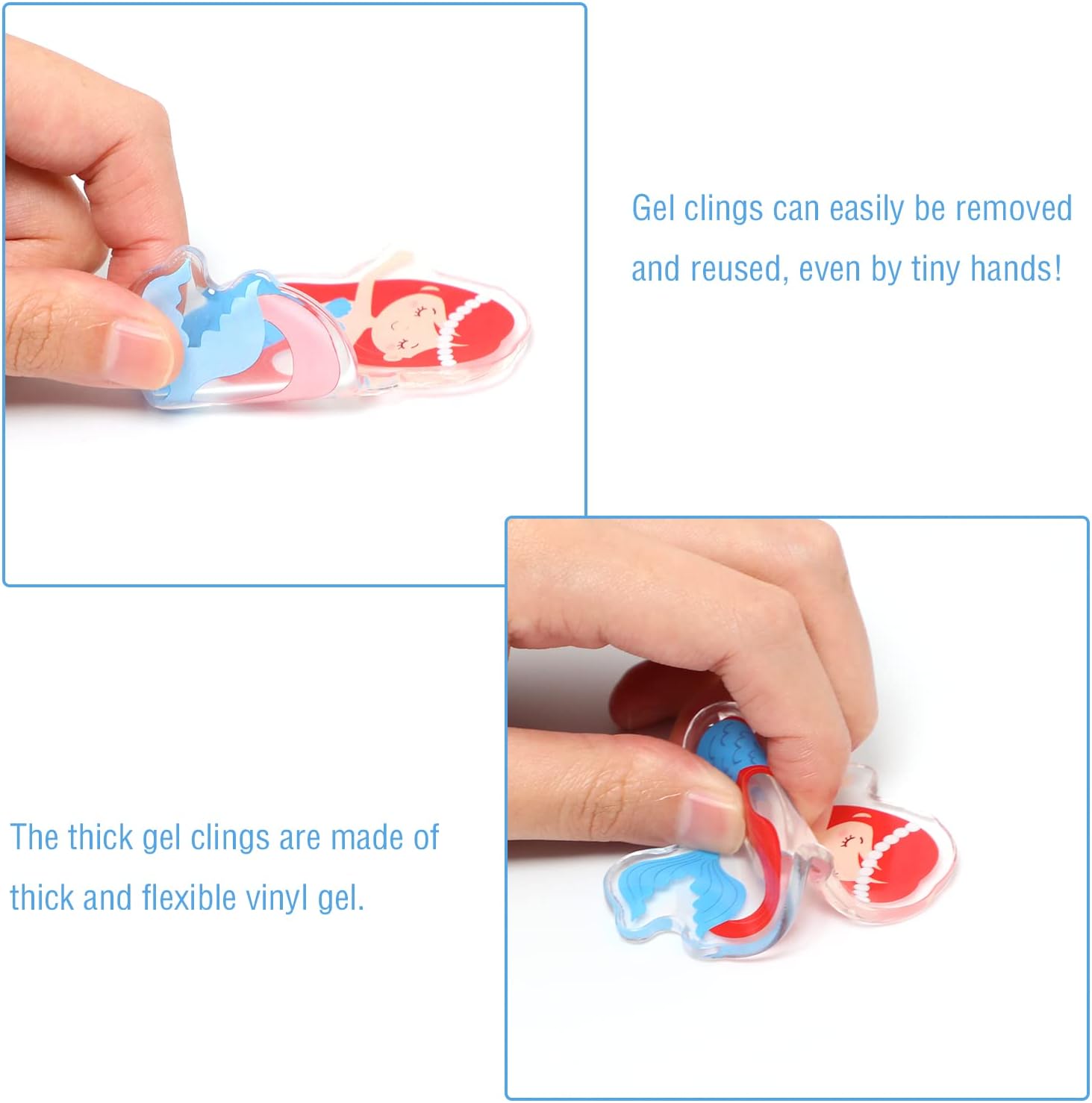 - Note:Mermaids thick gel clings are not edible. These thick gel window clings are suitable for children 5 years and older to play, and there is a risk of suffocation. They need to be accompanied by an adult when playing.