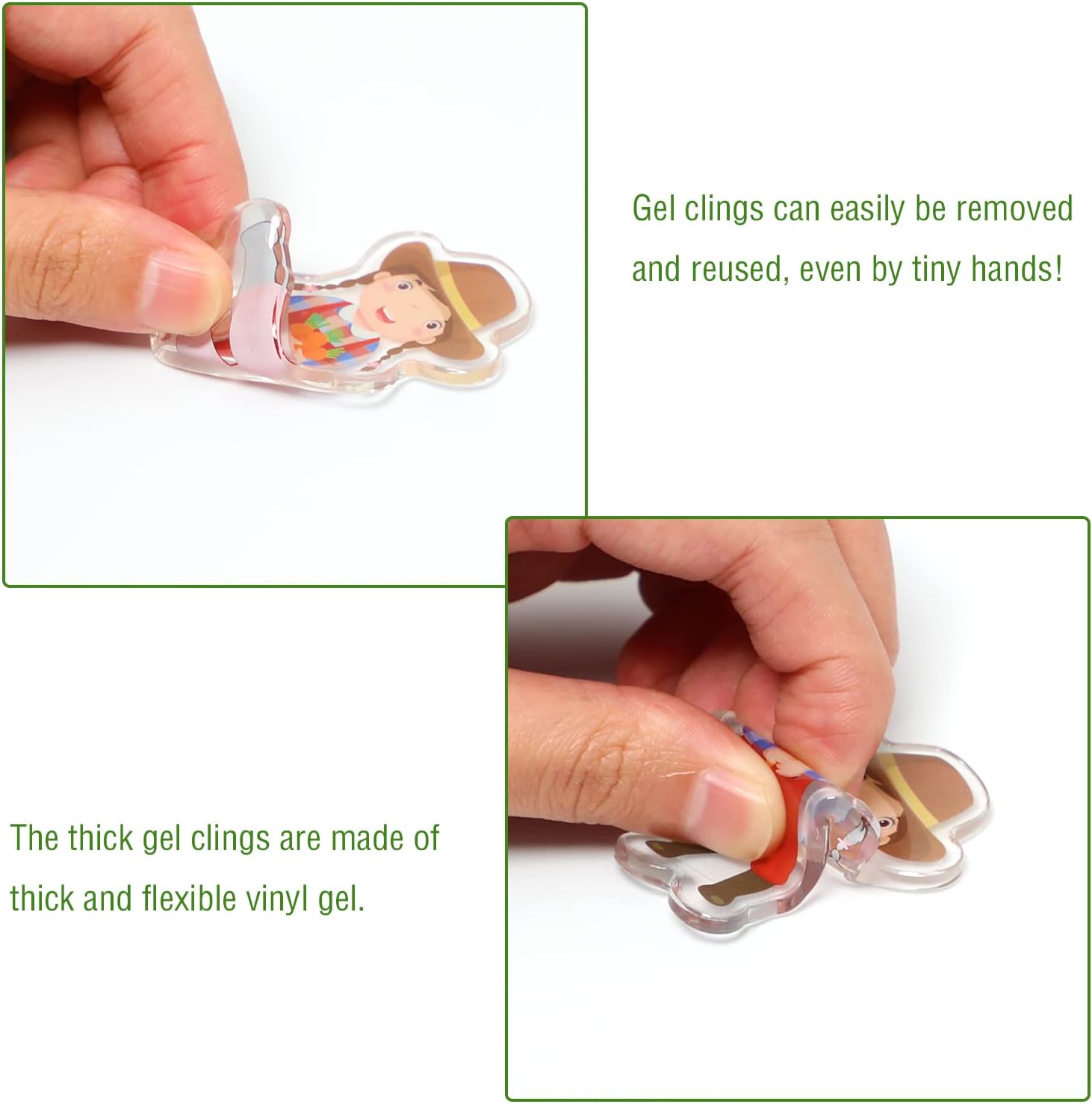 - Note:Farm animals thick gel clings are not edible. These thick gel window clings are suitable for children 5 years and older to play, and there is a risk of suffocation. They need to be accompanied by an adult when playing.