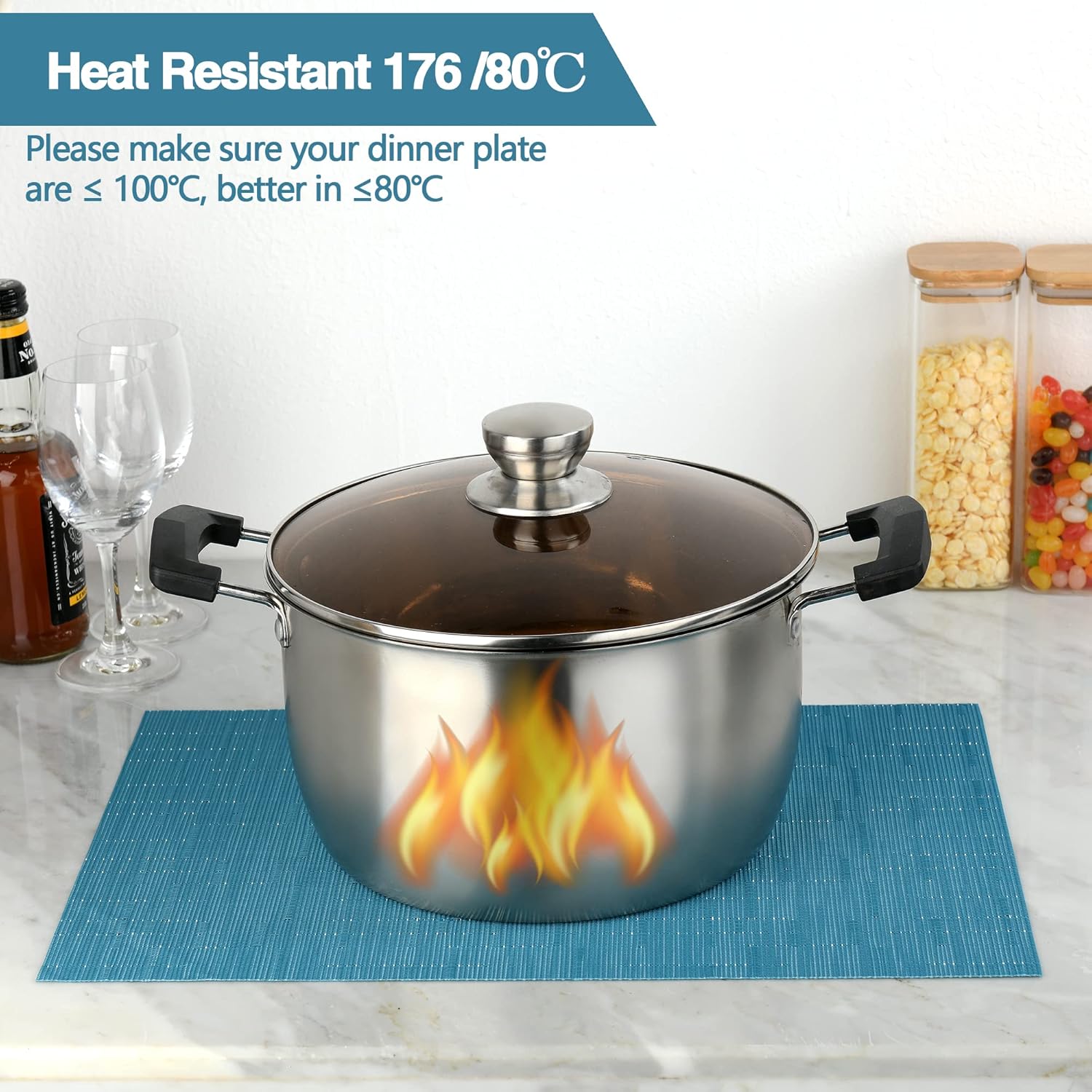 - Heat Resistant: Please make sure your dinner plate are β€ 100β, better in β€80β. It can prevent the table from slipping and scalding the countertop. These beautiful stylish vinyl place mats to add more fun to your dining table
