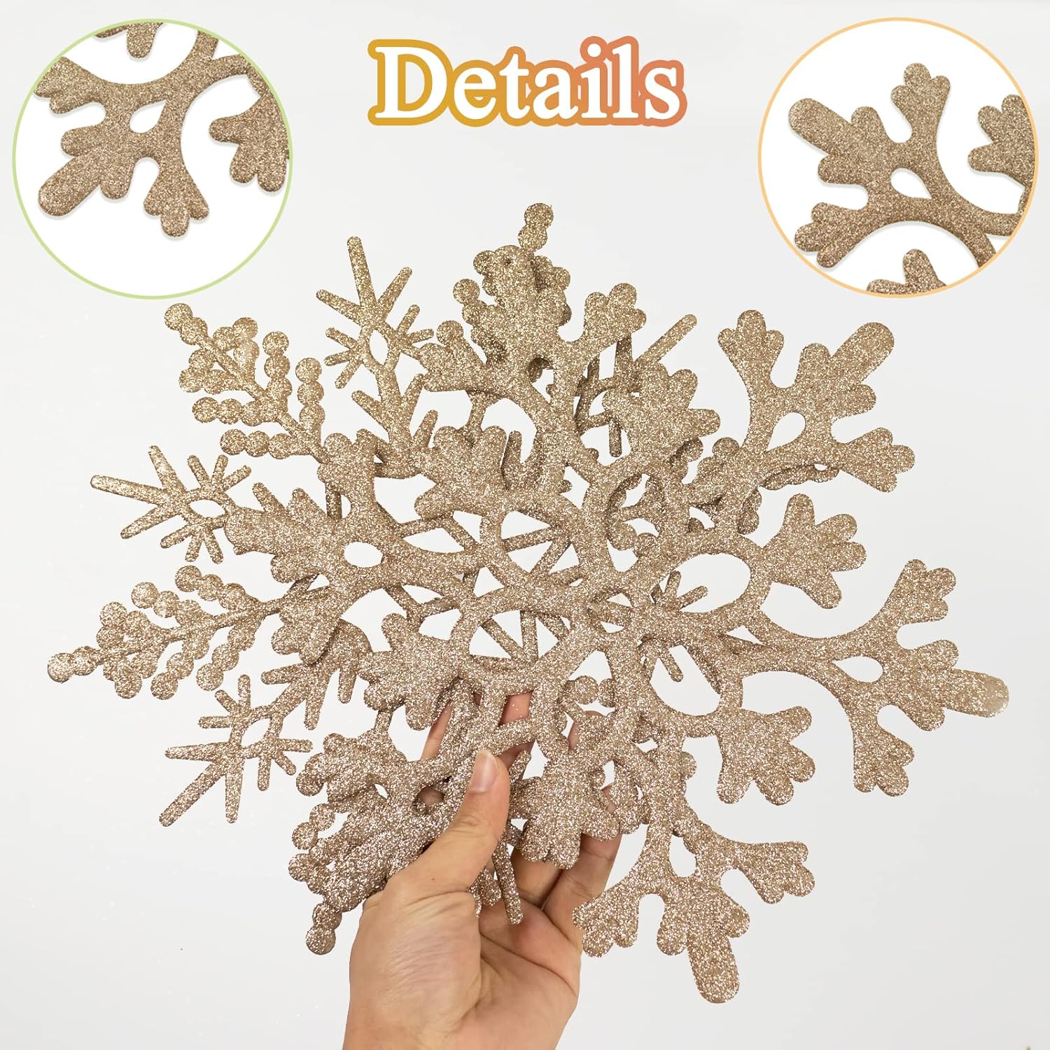 - STURDY BIG SNOWFLAKES: These champagne gold snowflakes are well made of quality plastic with sparkly glitter scattered on them, stunning and reusable, able to stand up to bad weather outside and keep their shape well. Glitter attached closely and not easy to fall off, absolutely great Christmas decoration ornaments for years of use, save them