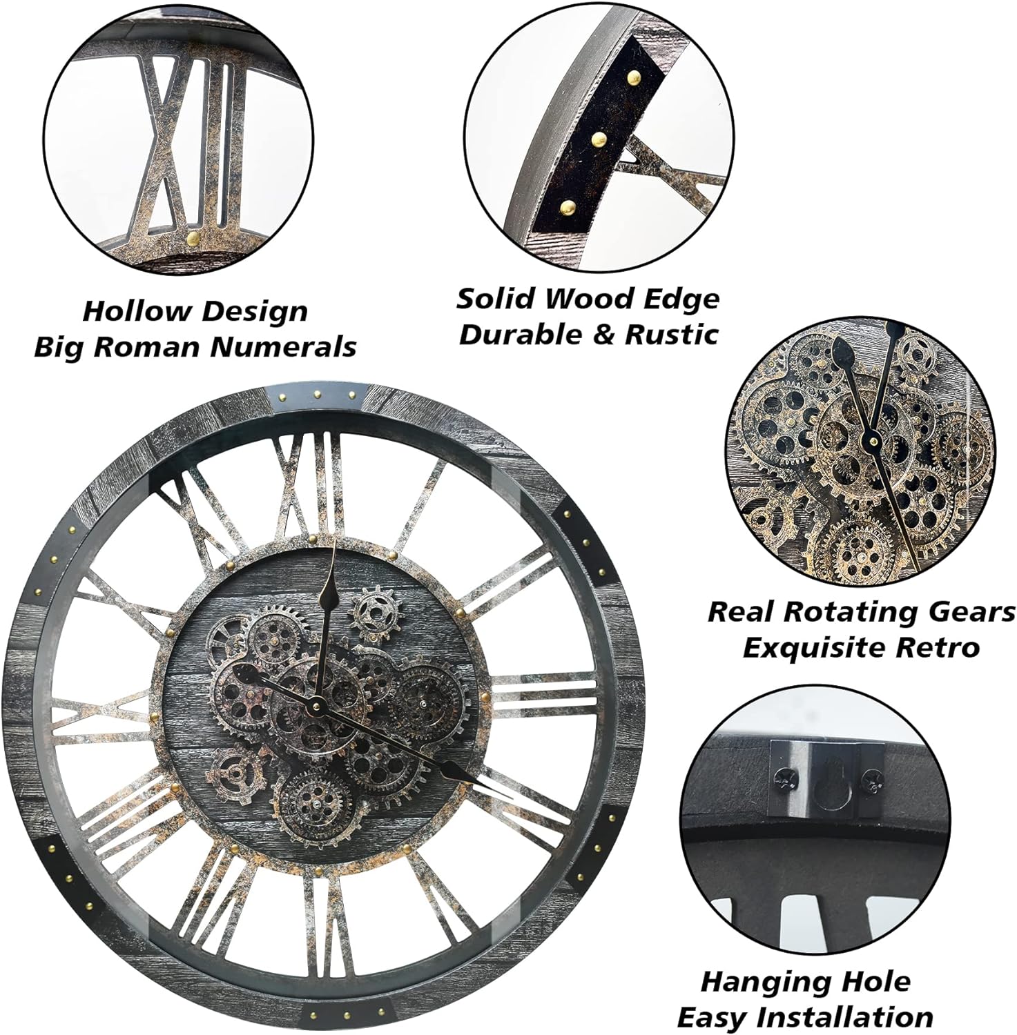 - Unique Design, Only For Your Home: Round solid Wood frame and classic retro skeleton with real mechanical moving gears in the central, the wooden frame is handcraft, showing unique attractive wood grain color and small natural knots; artificial rust-imitated treatment marks on the skeleton for vintage and industrial effect; stronger tempered glass resists any breakage and keeps safety whenever; The design is very different from other clocks, just to break the ordinary, only for your home