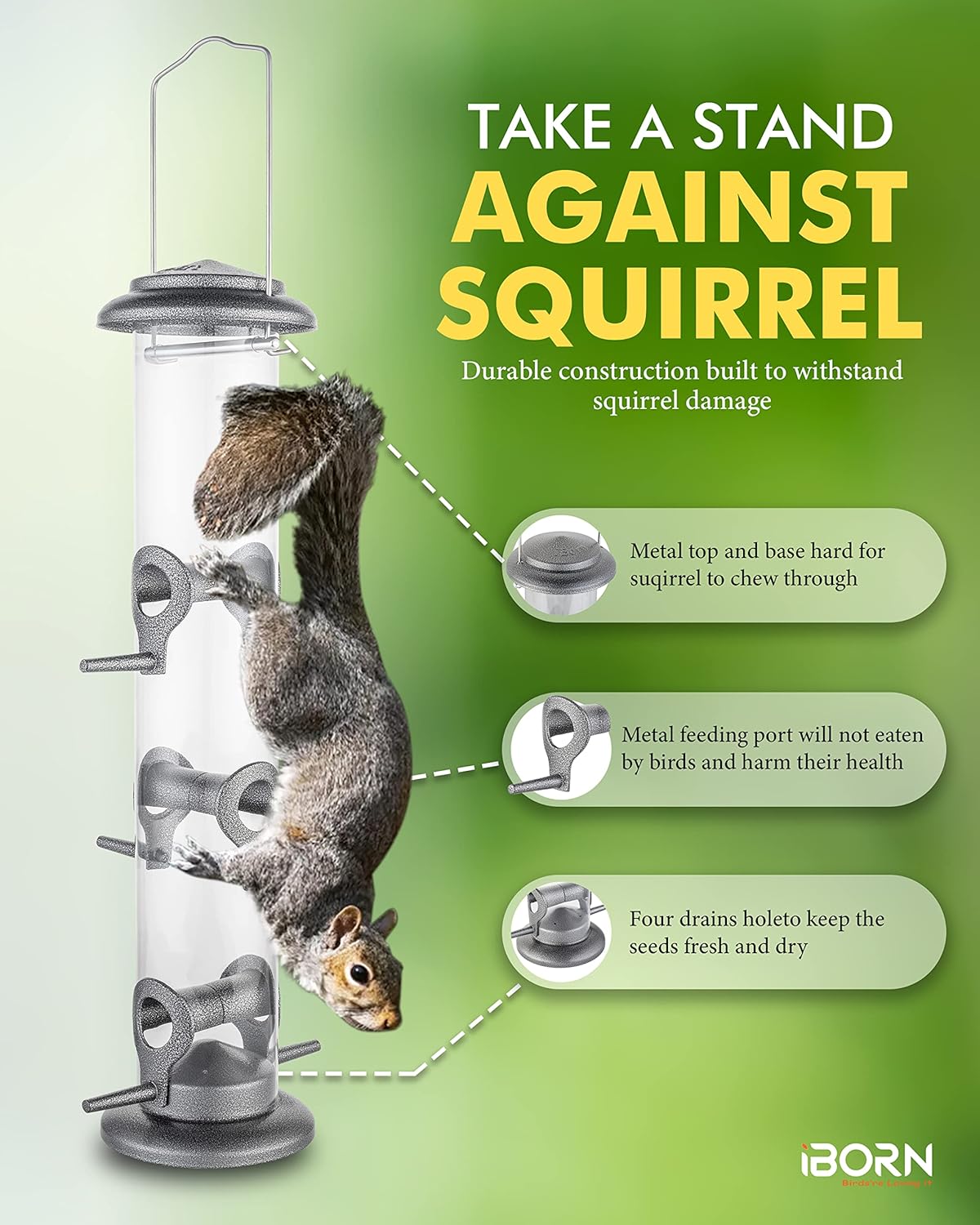 - 【Metal Bird Feeder】Metal top & base, aluminium feeding ports survived from Squirrel Damaging. Durable quality to sustain wear and worn outdoors. We adopt advanced technique for metal finishing to help the metal last longer when used outdoors.