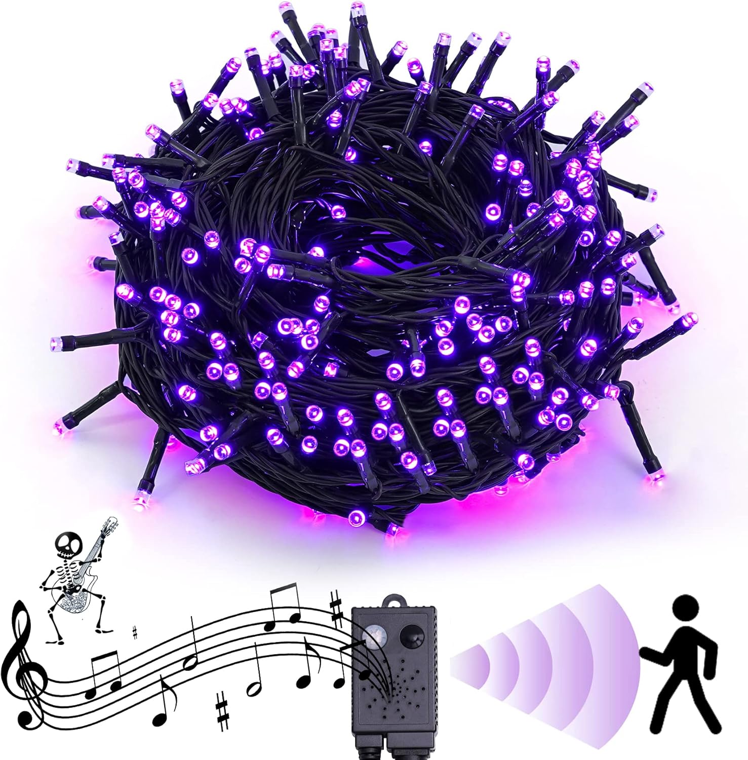 - 【300 LED Halloween Music Lights】The smart 300 bright LED purple Halloween lights built-in high sensitivity motion sensor, which will be sync with the rhythm of Halloween spooky sounds. The total length is 114.8 ft with dark green wire, which is large enough to cover the bush, fence or fireplace with a decent amount of lights. Approximately 16.4 ft lead cable which is long enough to plug in the power supply from anywhere. Add a little creepiness to your Halloween decor this year.