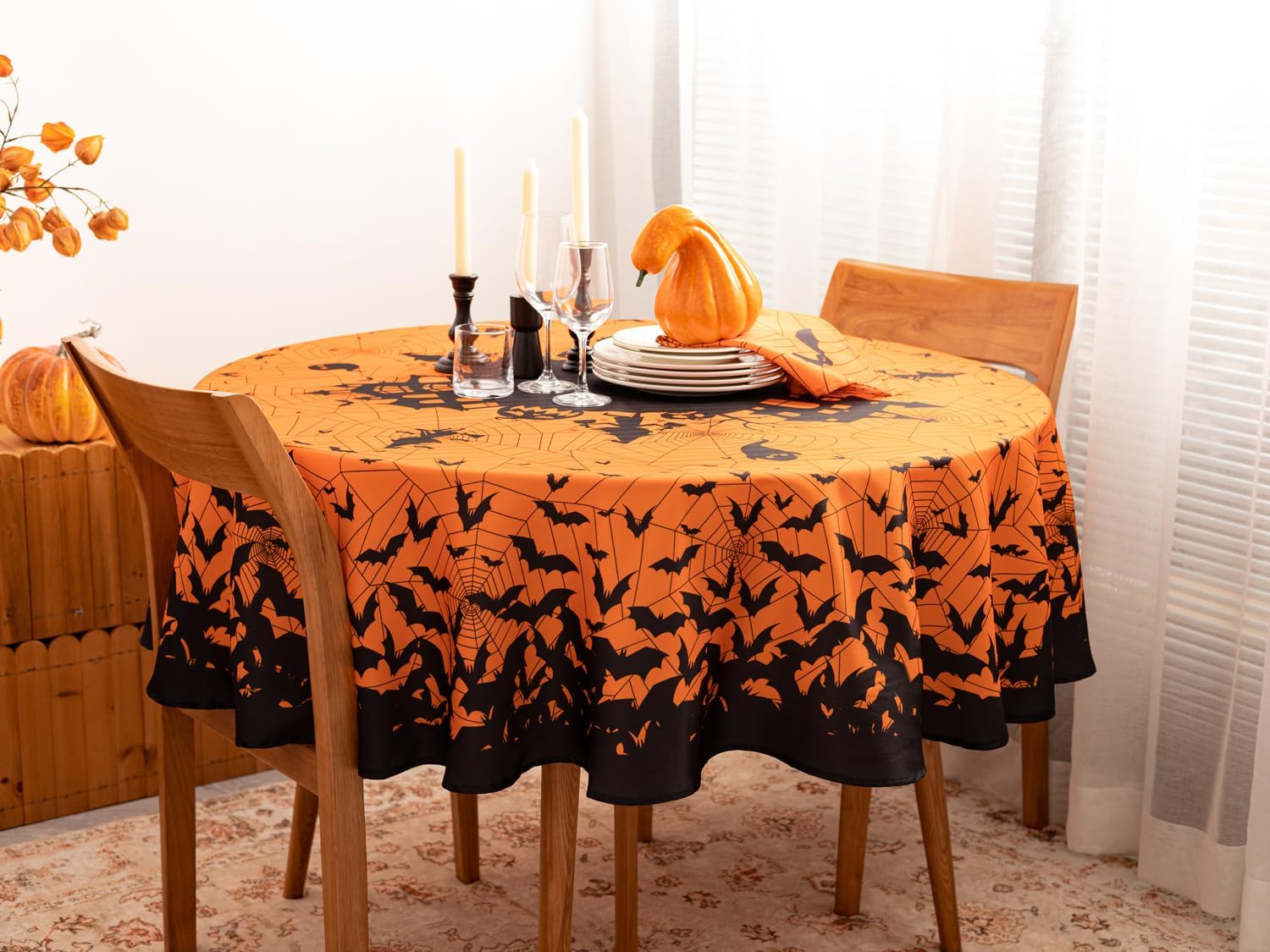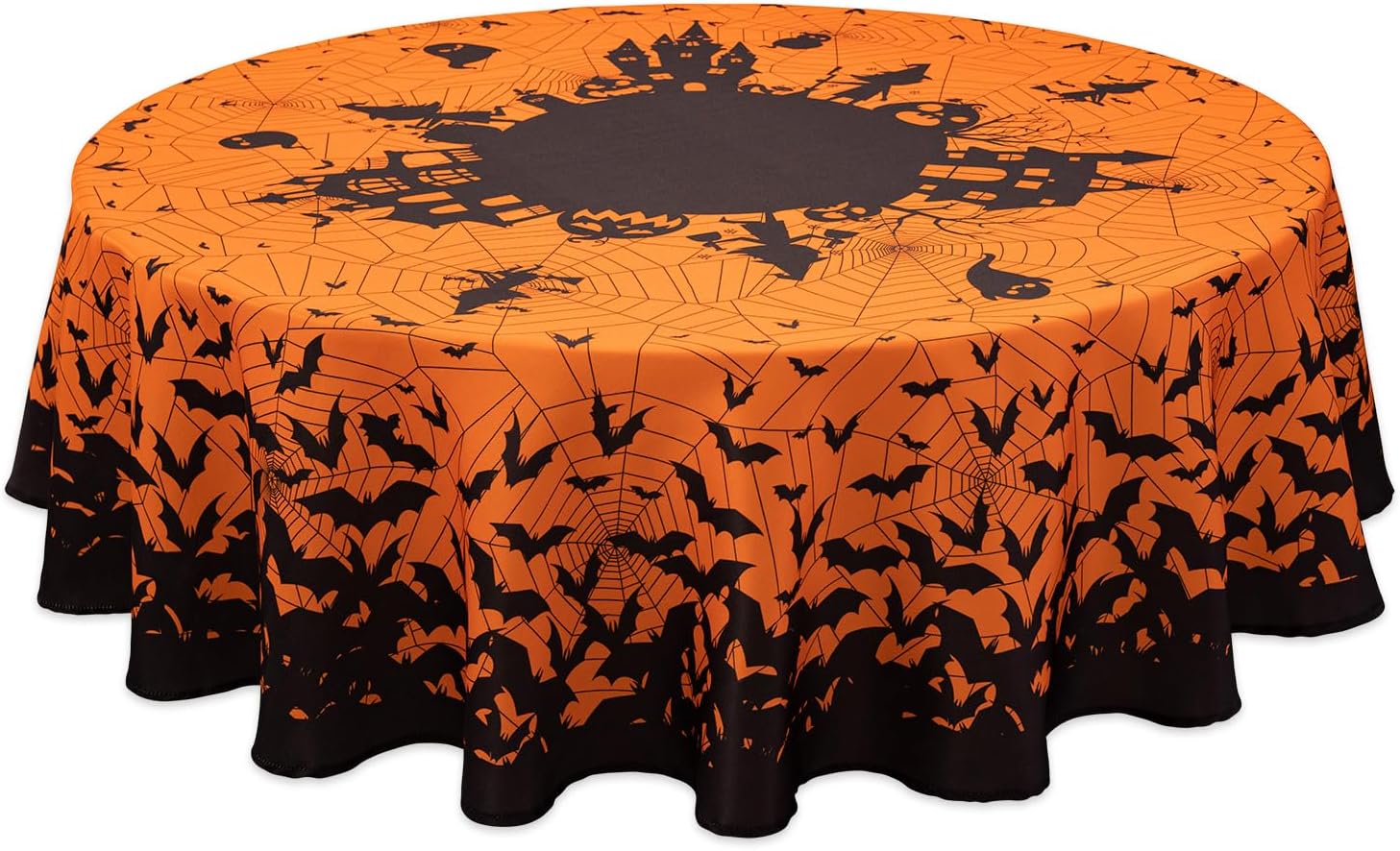 - ADD A CREEPY FINISHING TOUCH: This printed tablecloth is the perfect addition to decorate your tabletop for Halloween parties; The black haunted house design and hanging bats and spider web over the orange tablecloth make a cute, festive decoration.