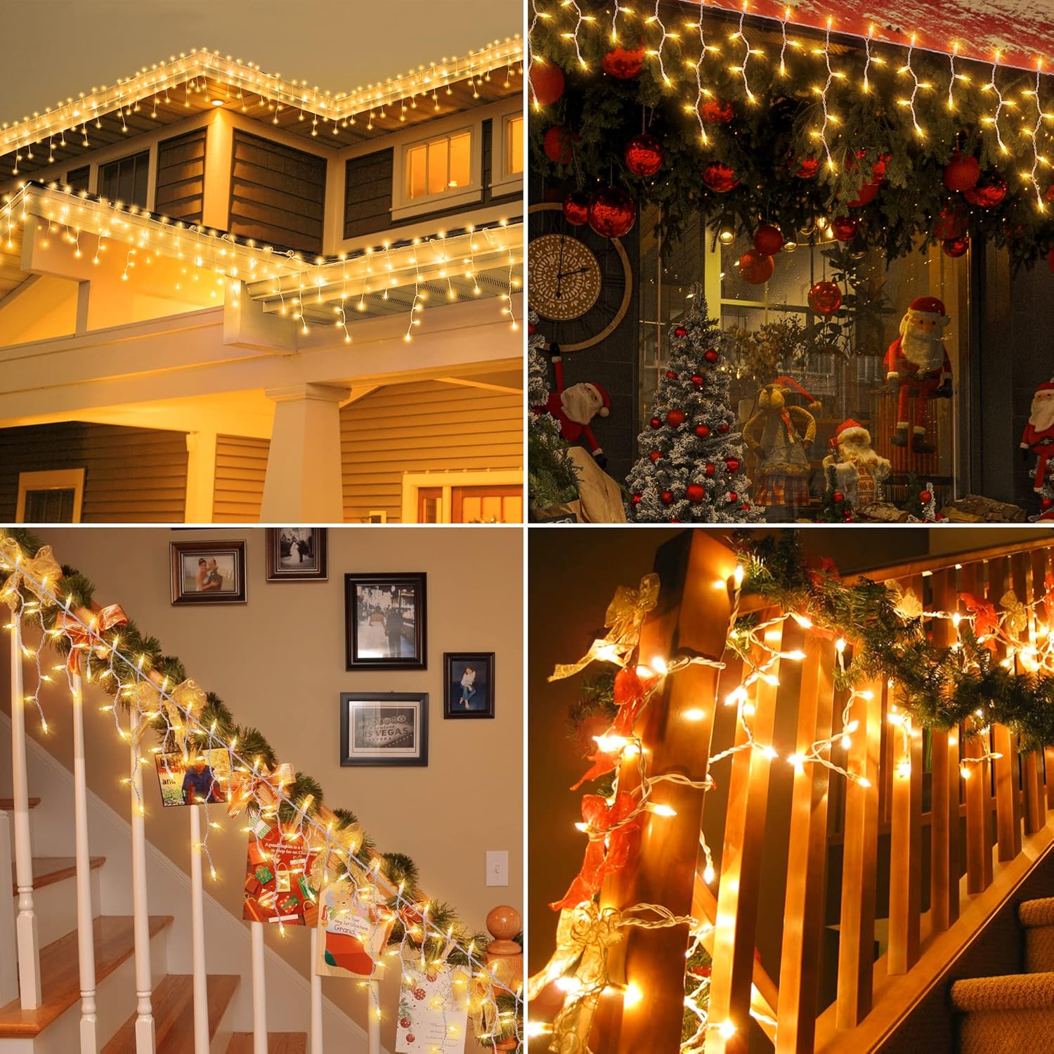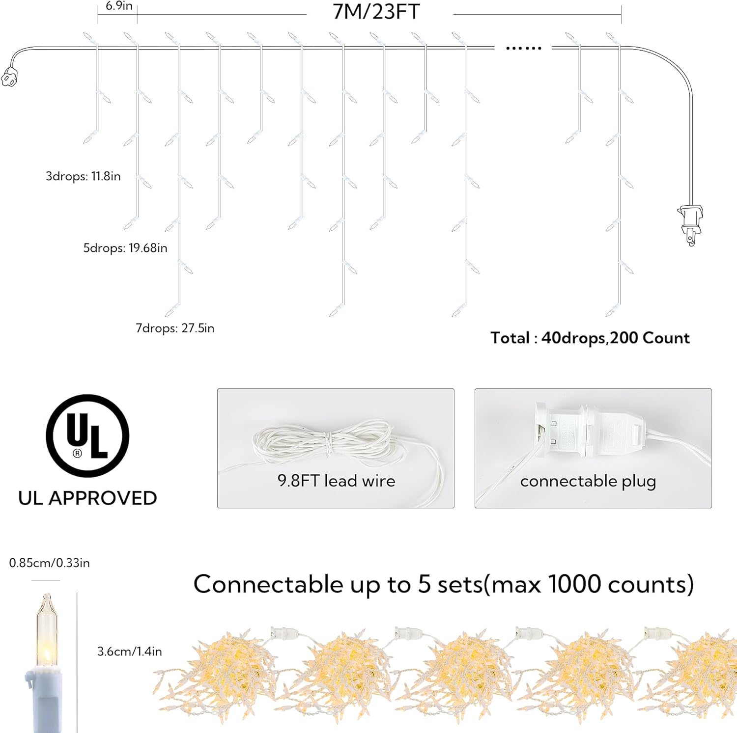 200 Christmas Icicle Lights, Warm White Clear Bulbs with 23FT Long White Wire, Professional Grade String Lights for Indoor & Outdoor,Xmas,Party, Patio, Courtyard, Window, Fence, Trees Decor