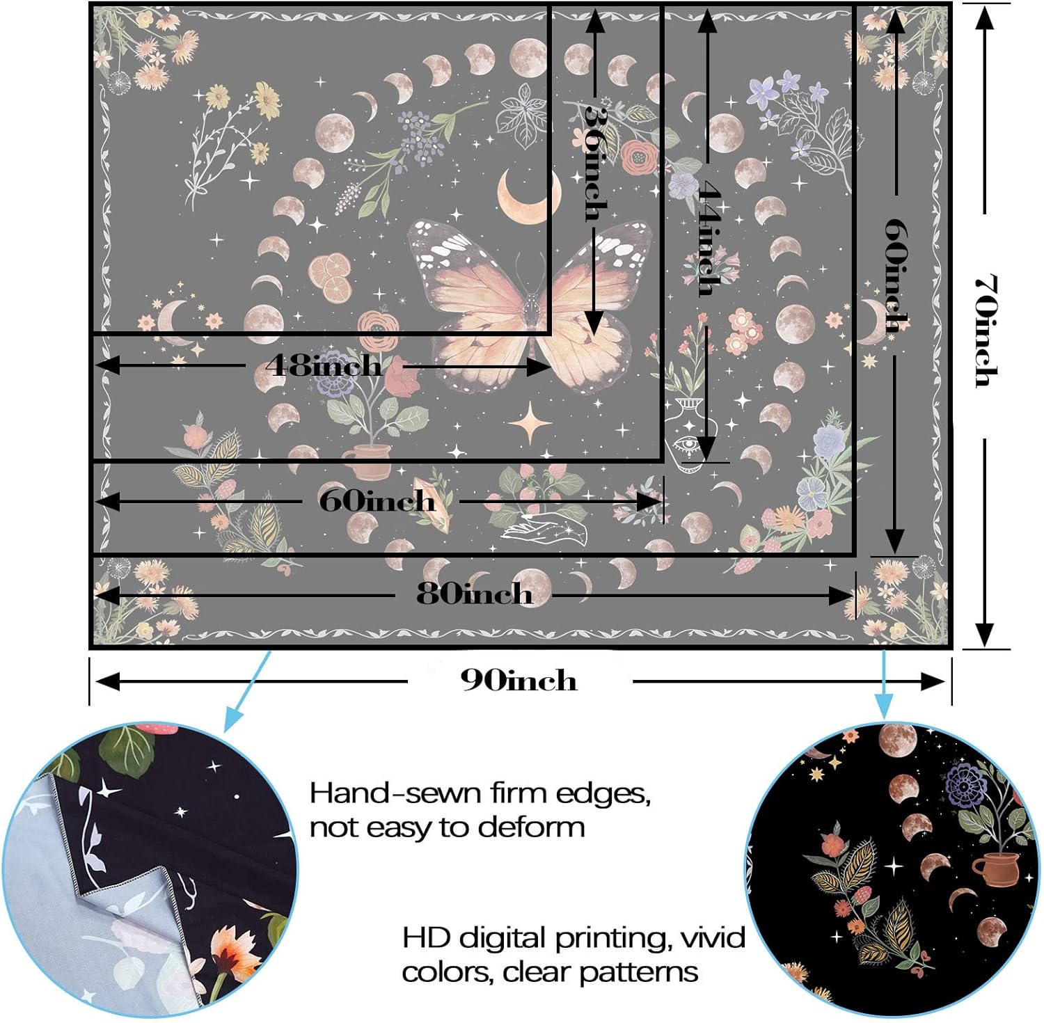 - 【Practicality】: This moon phase tapastry's can be used as wall decor, aesthetic poster, bed cover, beach blanket, picnic blanket, table cloth, etc.