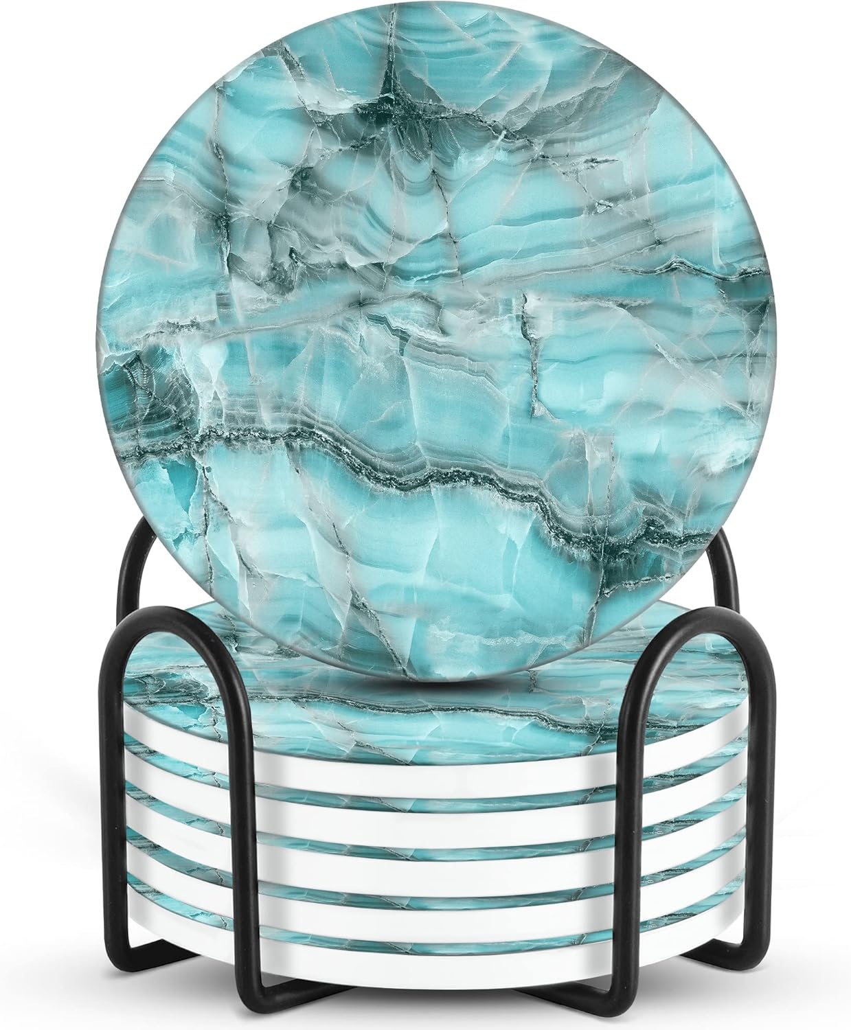 Emerson Coasters for Drinks Absorbent – Natural Stone Drink Coasters Set with Holder, Coasters for Coffee Table, Wooden Tabletop Protection Marble Style – 100% Heavy Duty Set of 6 (Aura)