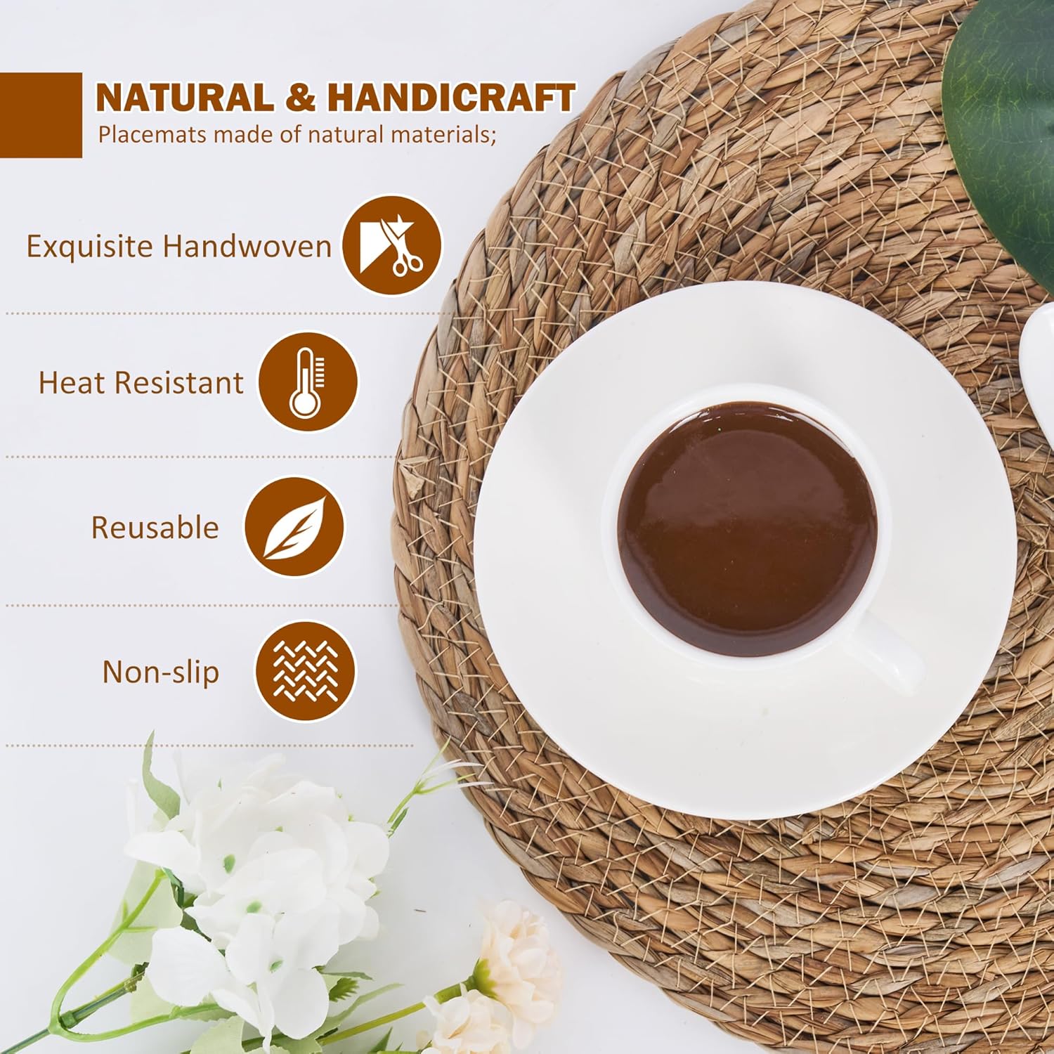 - 【Natural Design&Handcrafted】: Woven Placemats feature a sturdy woven design and round silhouette, This Round Placemats have very tight woven cattail grass (water hyacinth)design and well sewn placemats are carefully handcrafted and made of natural 100% water hyacinth, Easy Cleaning: Simply clean with damp cloth then store in a dry place.