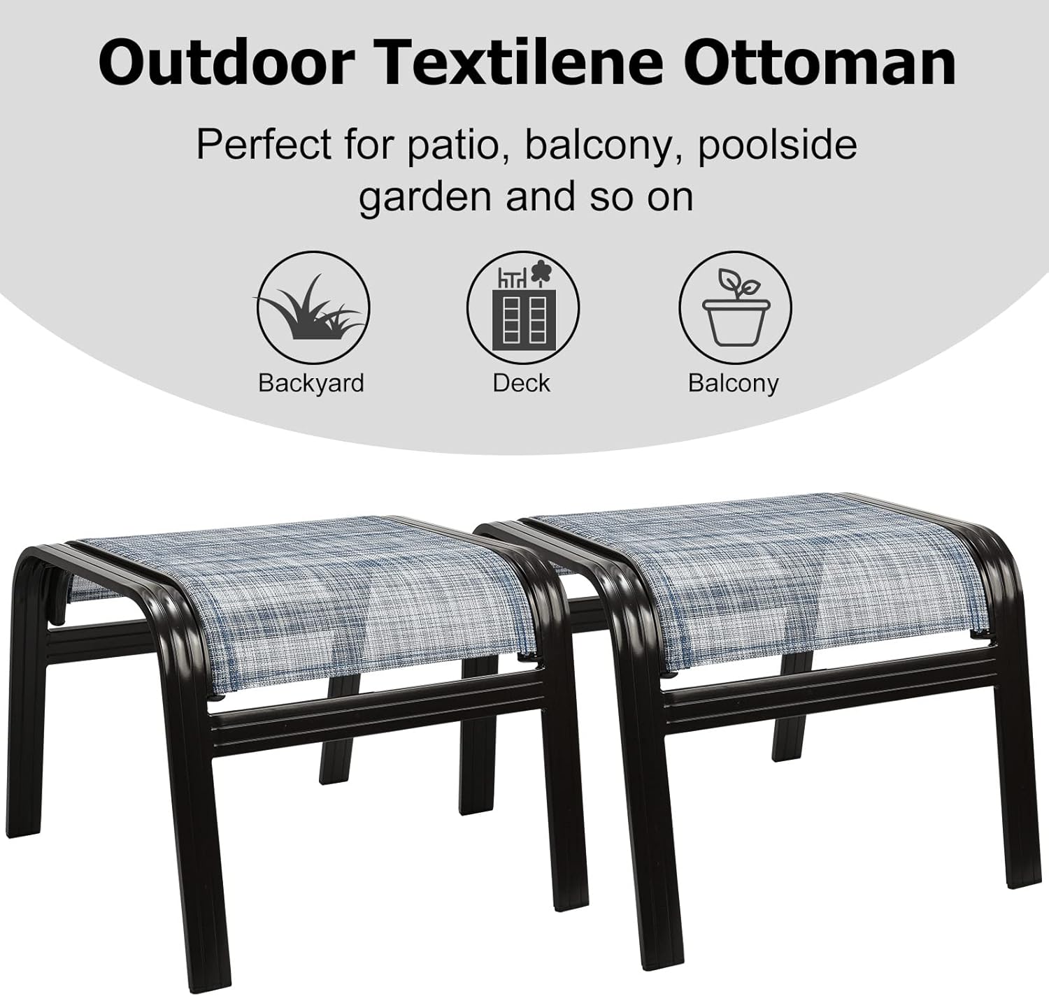 - With the concise design and classic patio appearance, the ottoman can complement with any daily occasions. It can be used anywhere you want, such as courtyards, lawns, gardens, balconies, swimming pools, porches, and indoors.These ottomans will suit you really well with your other furniture.