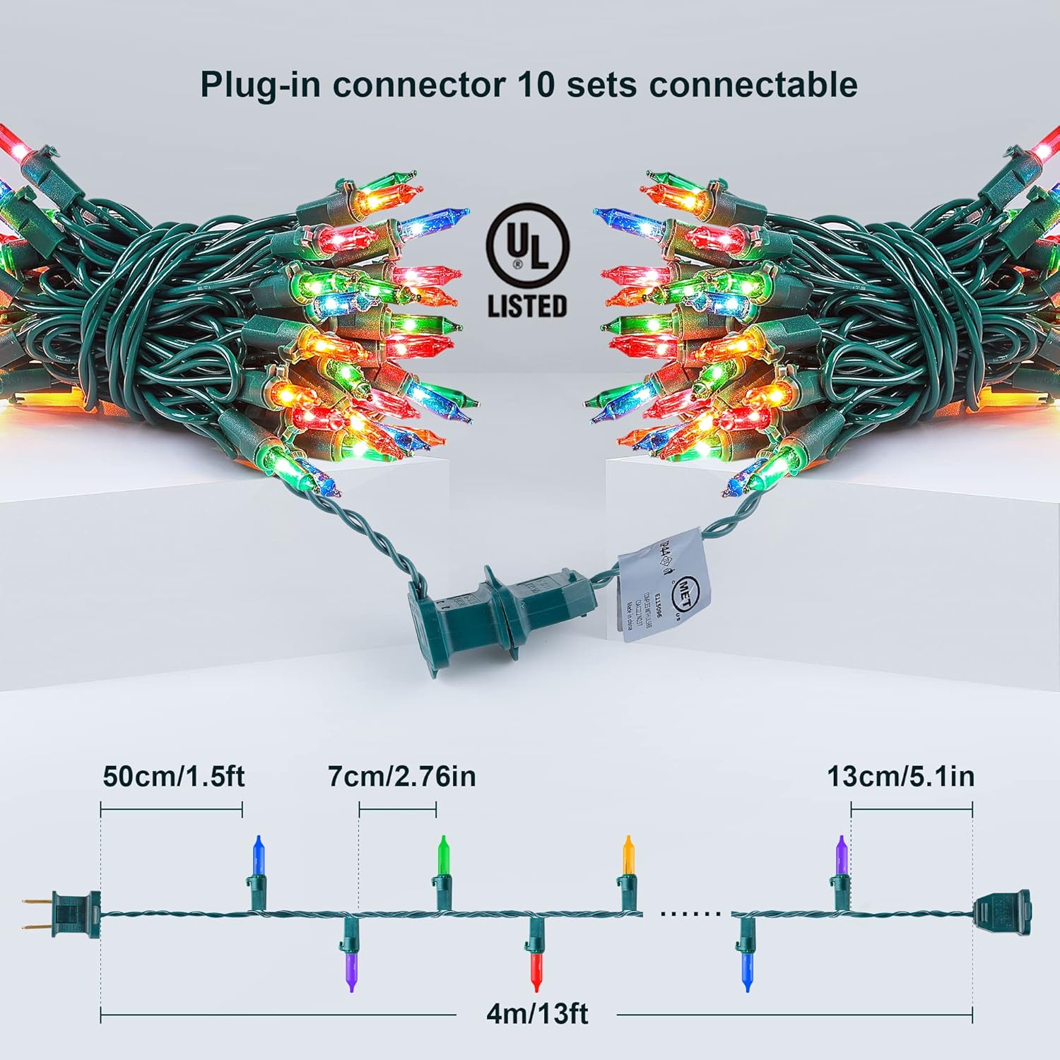 - 🎄Safe to Use : 50count Multicolor Christmas string lights are UL certified and the quality is guaranteed. Our Christmas strings lights have built-in fuses, which will protect the short circuit caused by the damaged wire and can effectively prevent the possibility of fire. High quality use rest assured. Warm tips: Please kindly protect these string lights from immersing in water and keep the plug dry.
