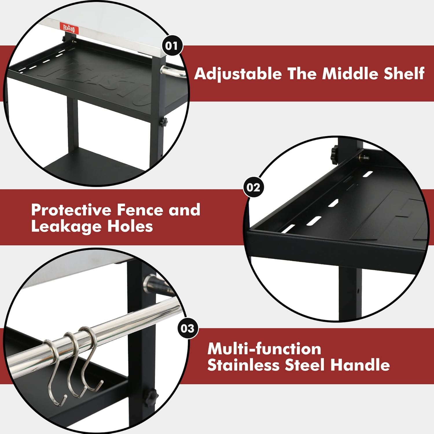 - Sturdy Structure: Feasto 3-Shelf outdoor grill table has a strong and durable heavy duty frame structure.It can hold 150 lbs in total. Meet all the weight needs during your using