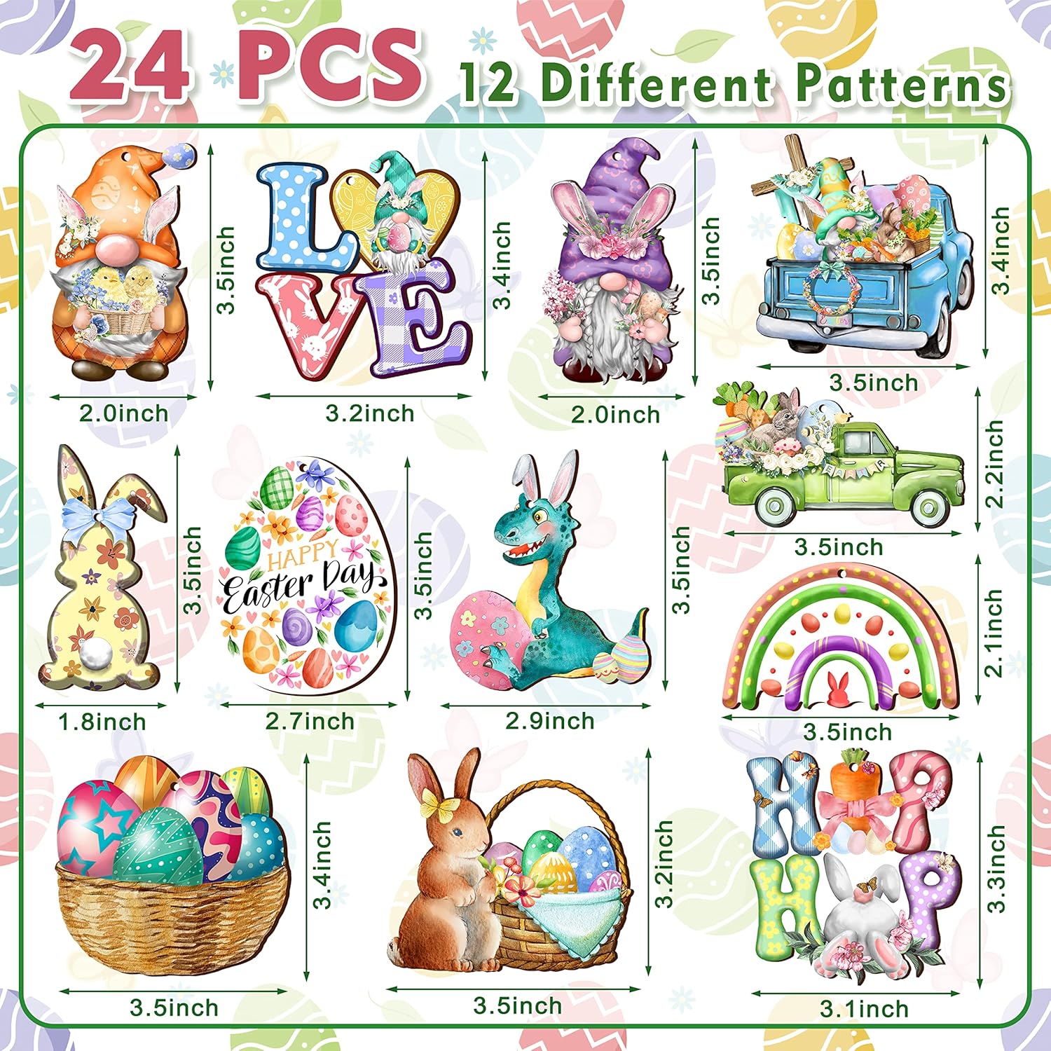 - New Designed Easter Wooden Tree Ornaments -- 24 PCS Easter wooden slices with exquisite workmanship in 12 different styles are made of high-quality wood, painting in front and empty at back.