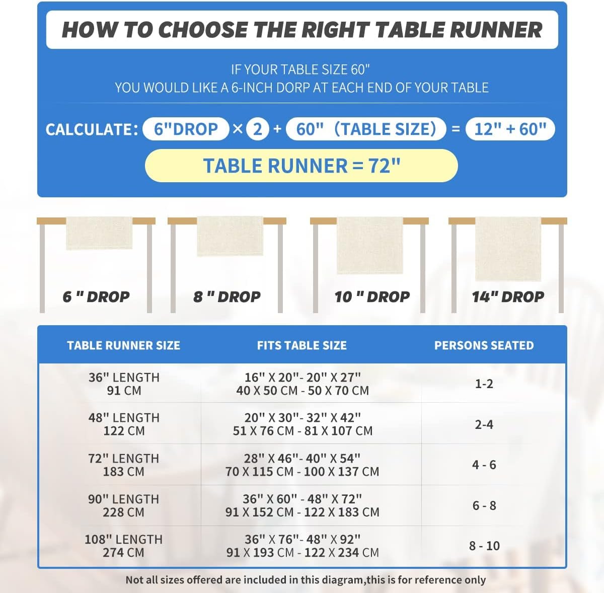 - Fits Table Size : This table runner is 13 x 60 inch, appropriate for a table that can seat 2-4 people, better match your table and give you a delightful dining experience