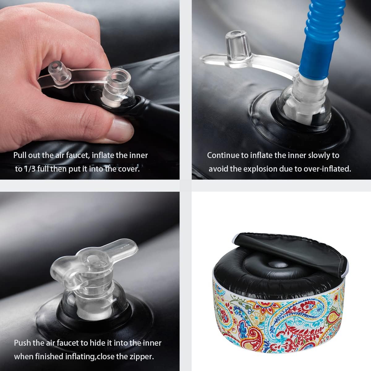- ăDurable Outdoor Materială-Inflatable ottoman cover made from durable, waterproof material that can withstand exposure to all weather. Fade-Resistant keep its original color and pattern even if exposed to the direct sunlight for over 500 hours. The black inner made of waterproof thick PVC fabric that can bear up 300 lbs.Very easy to clean and maintain.