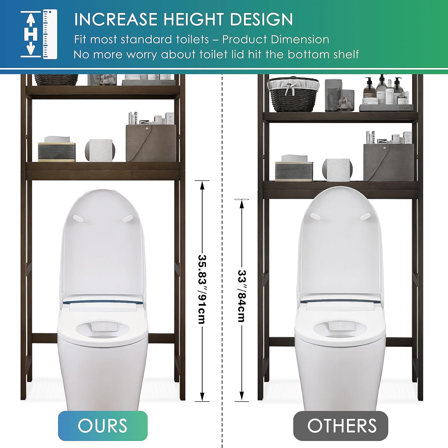 - DO’T WASTE SPACE ABOVE the TOILET: Designed to make full use of the blank space above the toilet, this space-saving toilet storage rack give you 3 adjustable shelves to hold all your bathroom essentials. Besides, placed it above the washing machine to store care supplies also would be a good idea
