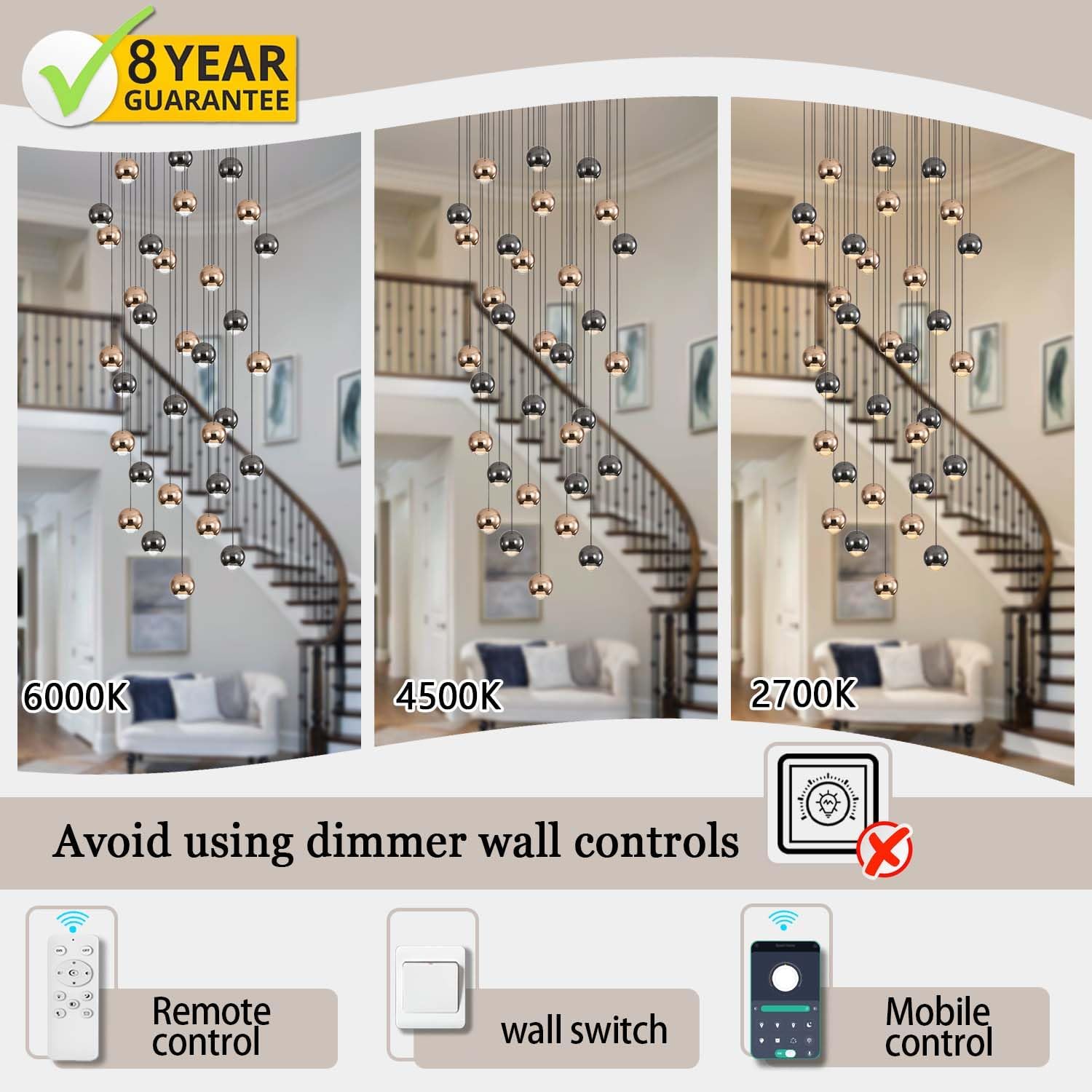 - 【Smart Modern Chandelier】:It is equipped with a remote control and APP control for seamless dimming between warm white (2700K) and cold white (6000K),as well as adjustable brightness ranging from 5 to 100 percent.