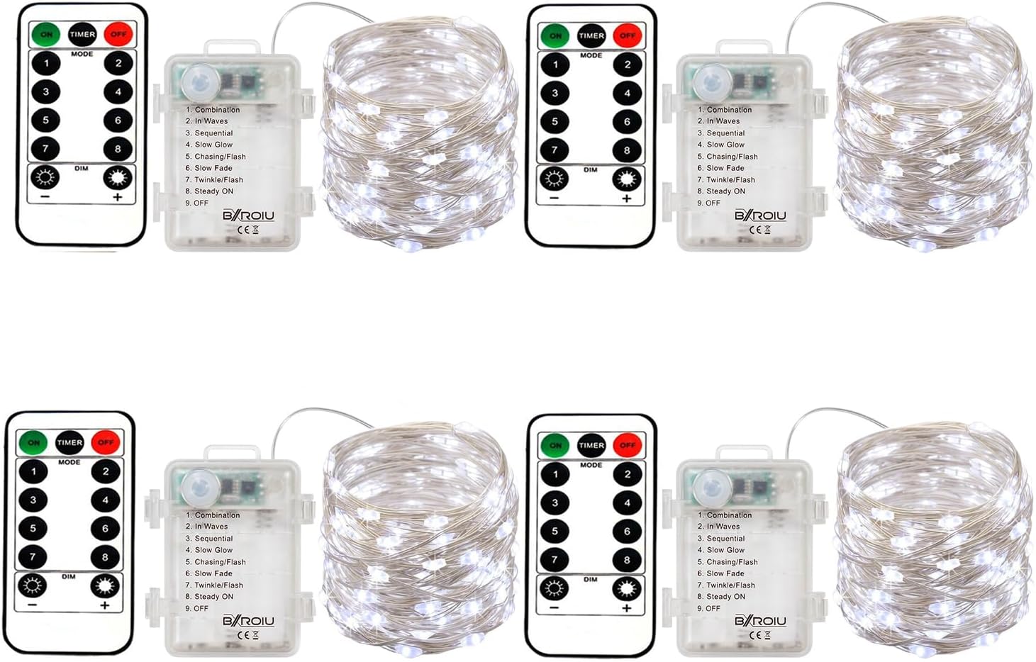 - ăLighting 8 modalsă fairy lights battery with remote control of 8 modals with different light types: wave-type change, continuous change, change of flicker, single light gets brighter and darker, slow-flash change, dreamlike change, burst flash, always bright