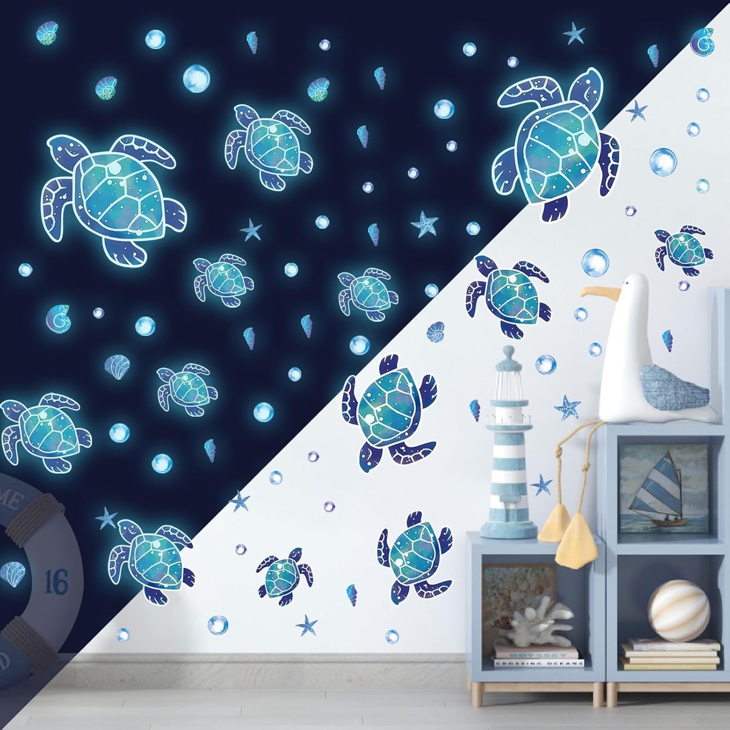 Glow in The Dark Sea Turtle Wall Decals,Under The Sea Turtle Bathroom Wall Stickers Ocean Wall Decor for Kids Baby Nursery Living Room Beach Room Decor