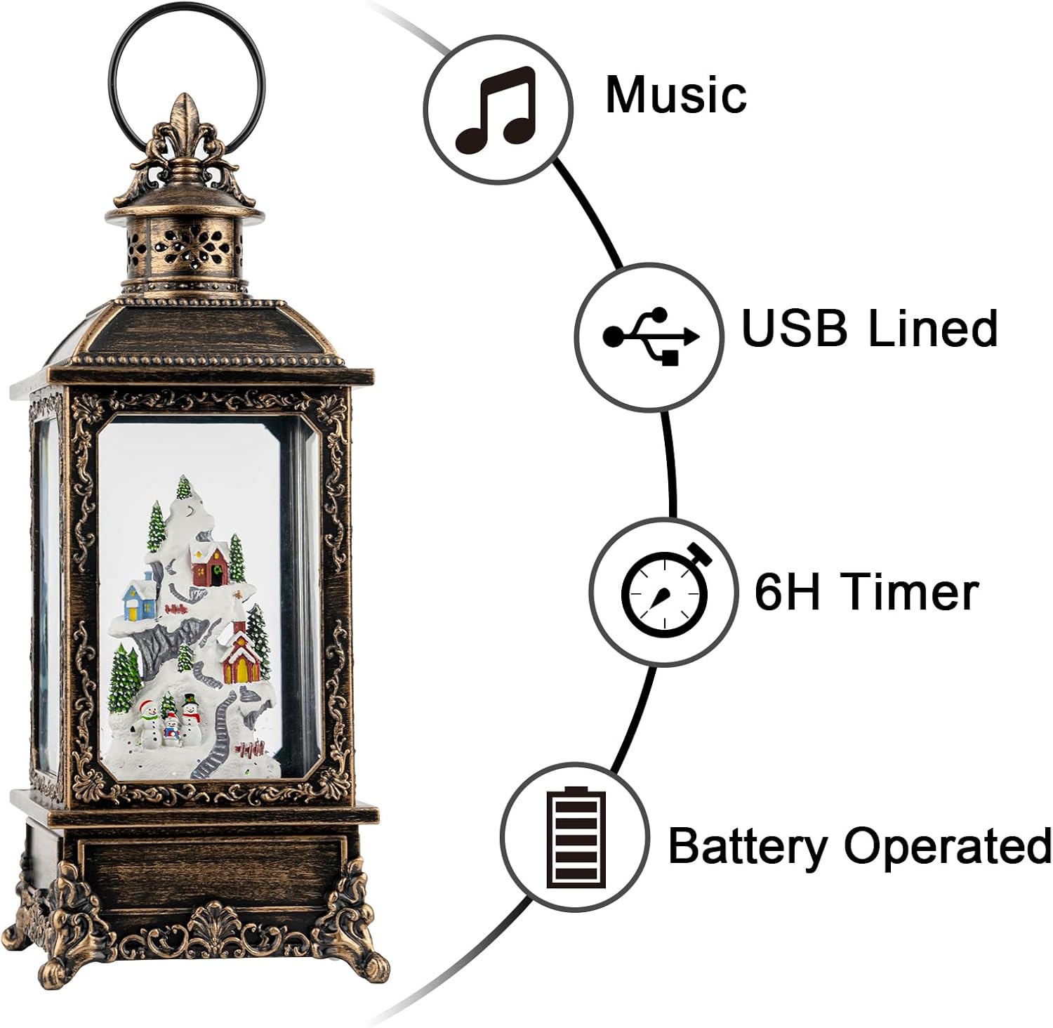 Christmas Village Buildings Snow Globe Lantern Water Glittering Snowman Family with Music & Timer, USB Lined/Battery Operated Lighted Lantern for Christmas Festival Decoration Gifts