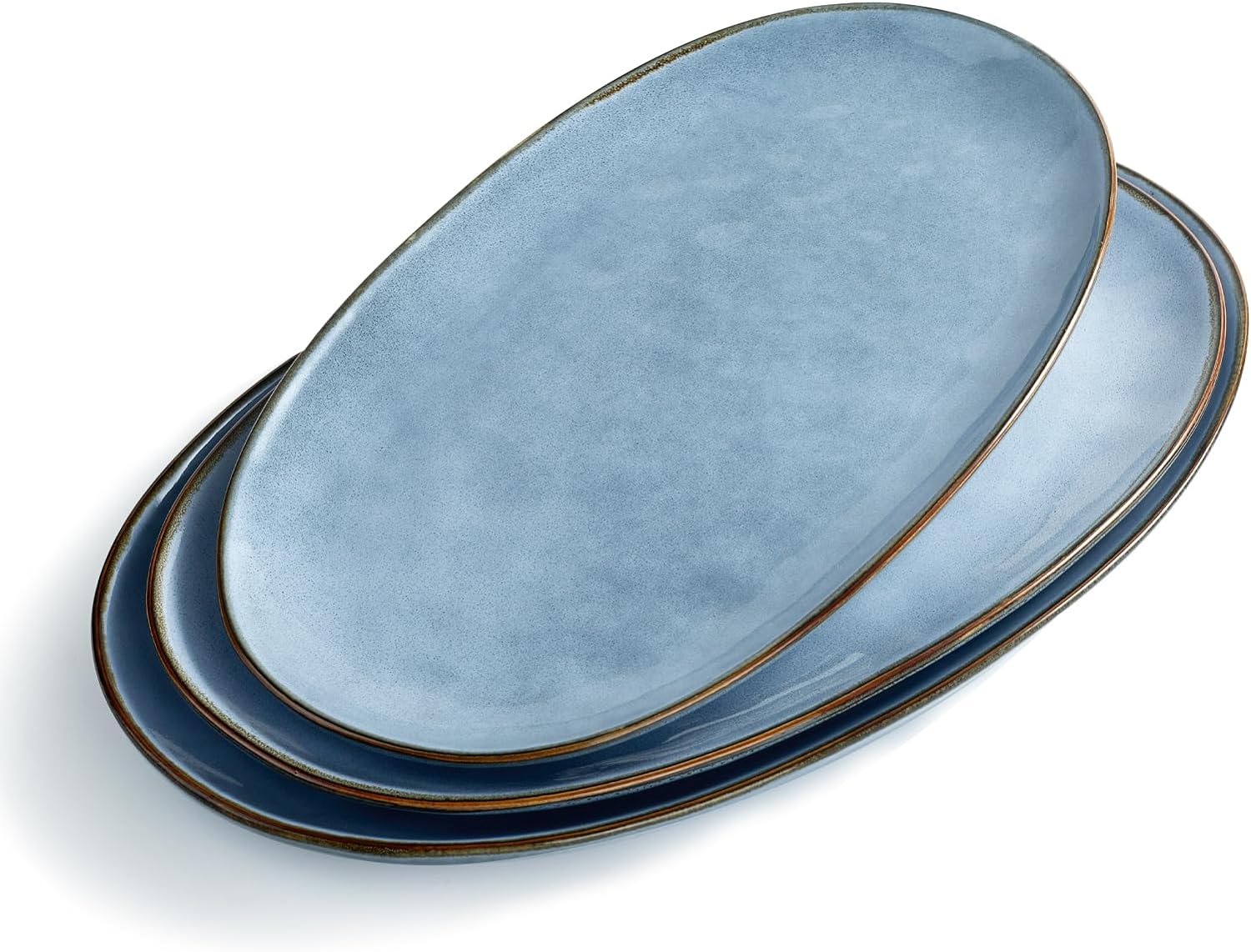 famiware Serving Platter, Oval 15.59/14.3/12.9inch Serving Dishes for Entertaining, Serving Bowls, Reactive Glaze, Stoneware Serving Trays for Party, Food, Turkey, Cheese, Ocean Series, Blue