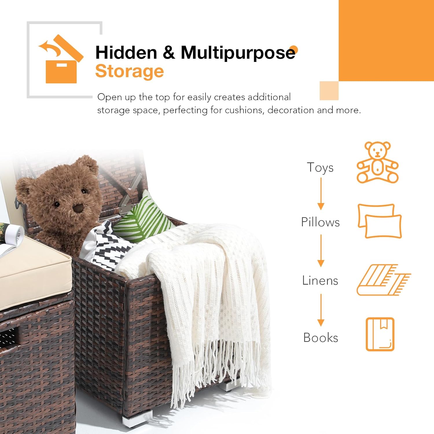 Patiorama 2 Piece Outdoor Patio Ottomans, All-Weather Brown PE Rattan Wicker Ottoman with Storage, Outdoor Footrest Footstool Seat w/Thick Cushion, Built-in Handle for Backyard Poolside Porch (Beige)