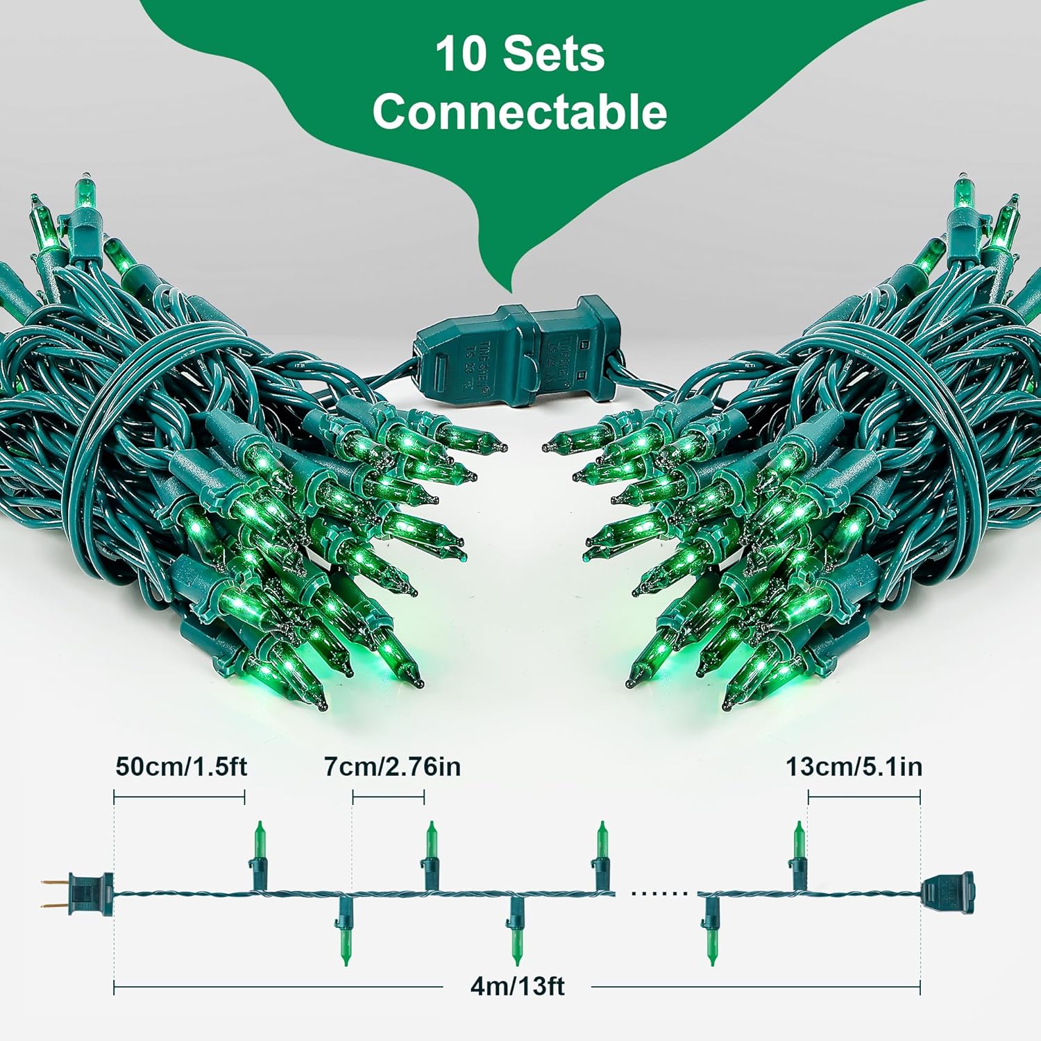 - 🌲Safe to Use : 50count green Christmas string lights are UL certified and the quality is guaranteed. Our Christmas strings lights have built-in fuses, which will protect the short circuit caused by the damaged wire and can effectively prevent the possibility of fire. High quality use rest assured. Warm tips: Please kindly protect these string lights from immersing in water and keep the plug dry.