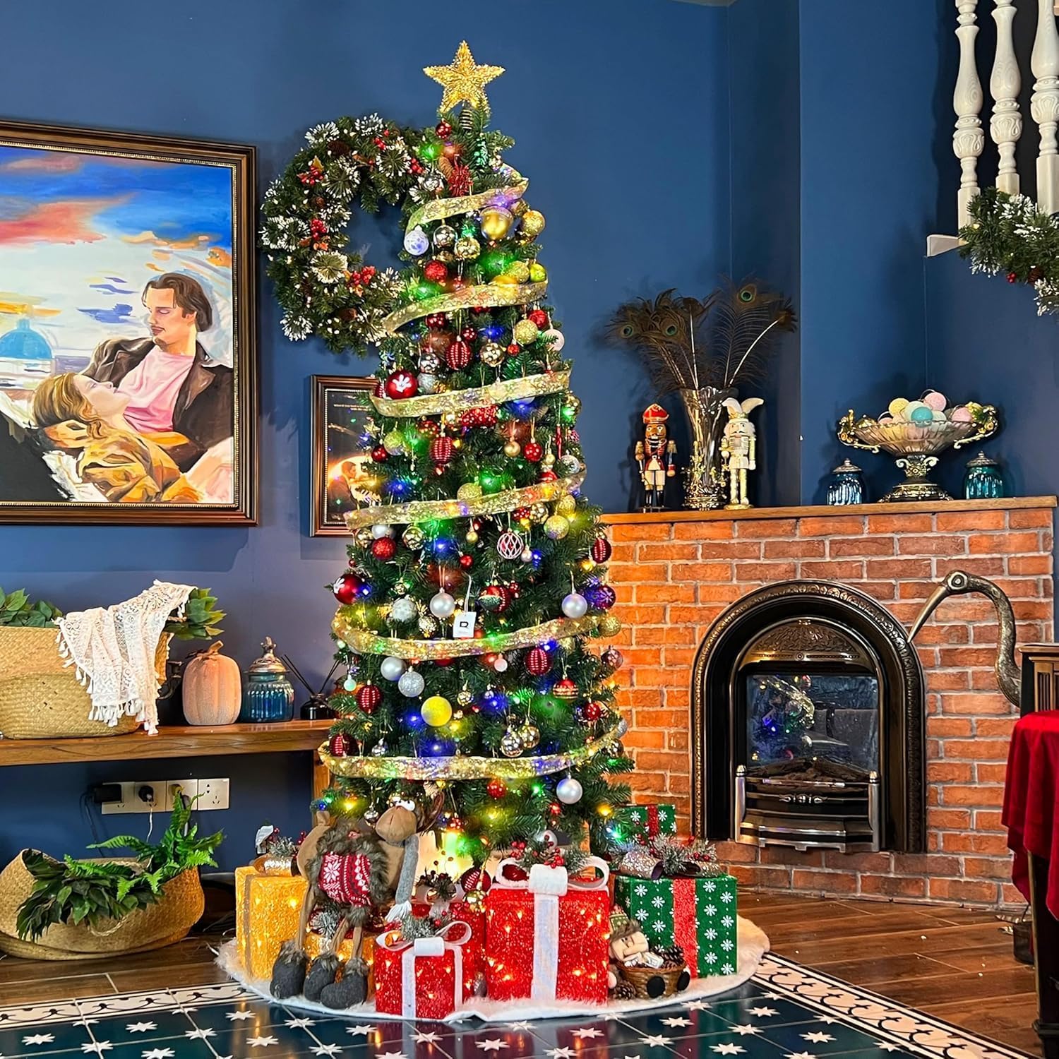 - PRE-LIT CHRISTMAS TREE: The Christmas tree is pre-strung with 200 color changing lights that change from warm white to multicolor with the touch of a button, add a fantastic festive atmosphere to your home. The bulbs are UL certificed, safely designed to remain lit even if one burns out. Included is a foot pedal switch to control 10 different light colors and actions