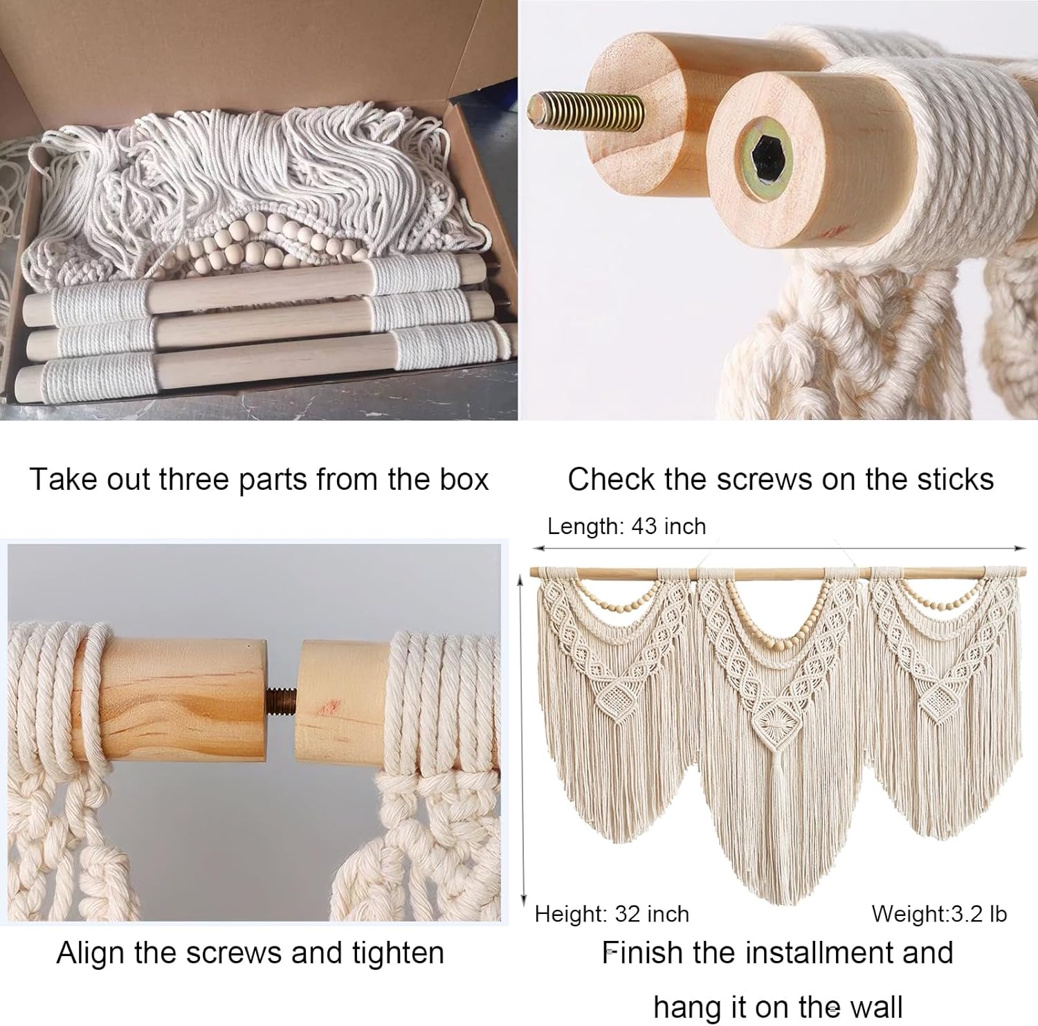 - Easy to Install: The package comes with 3 separate parts of short macrame wall hangings which could be easily connected together with the screws inserted in the wood rod.