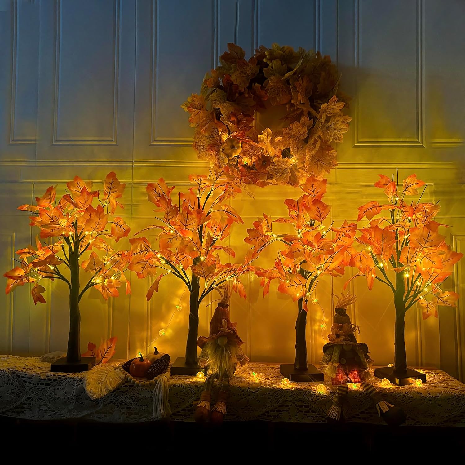 - đăLight Up Maple Tree Lightsă 4pack lighted fall decor tree ,Each maple leaf tree 24" overall height, 4" x 4" base, 24 warm white LED light up maple trees, powered by 3 AA batteries (not included) and USB power, perfect for desktop decorate.Fall Decorations for Home-This lighted fall tree is a wonderful and unique item that can brighten up any home.
