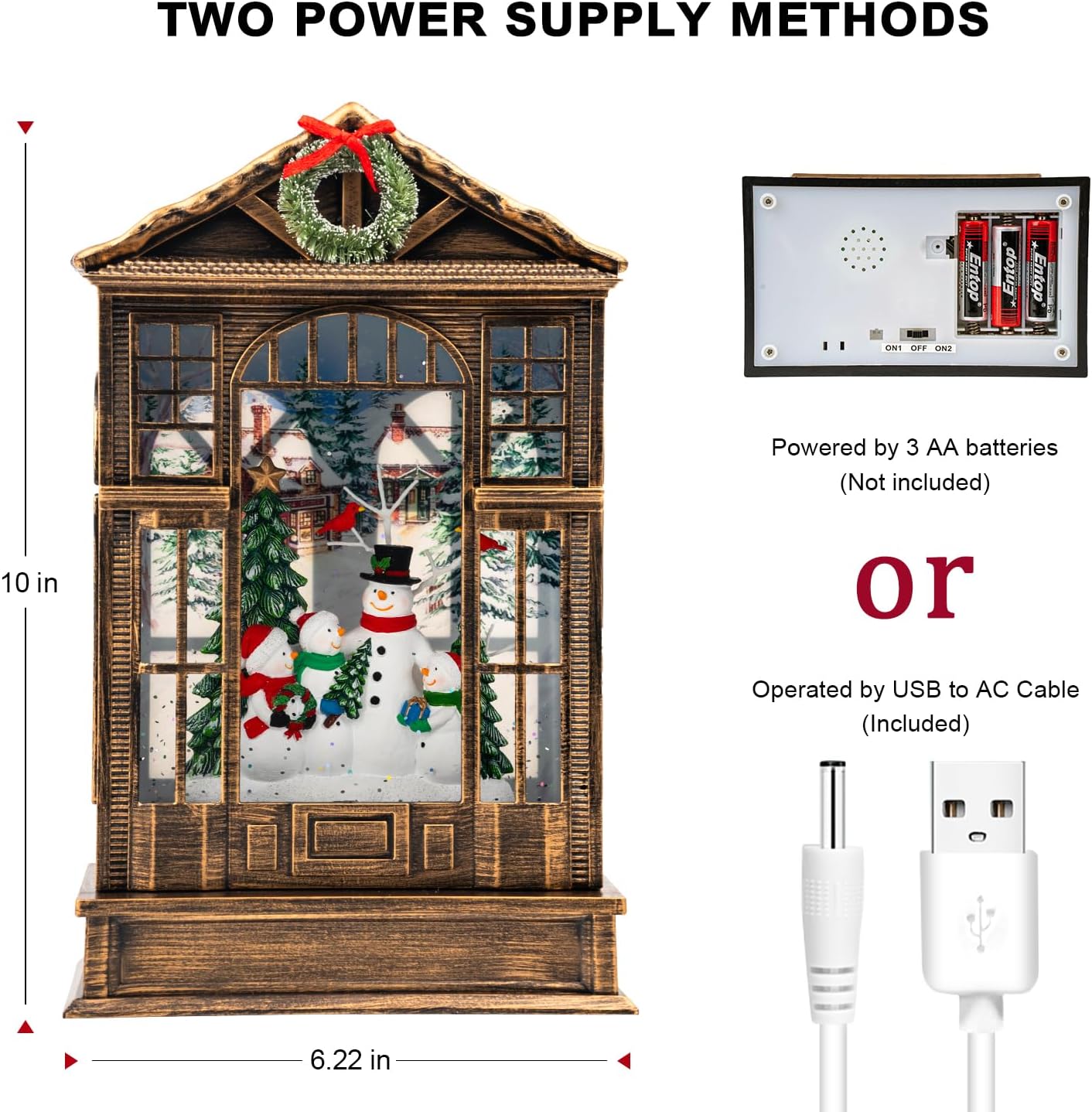 - 🎅🎄【2 Mode Power Supply】Powered by USB to DC cable (include), the snow globe lantern can be operated without batteries, which can save you a lot on batteries. & Powered by 3 AA batteries (not included), you can place it at any place that you want to add warm ambiance.