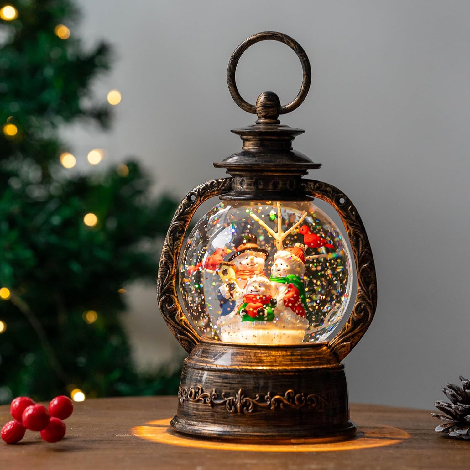 - 🎅🎄【Snow Globe Lantern】The lovely snowman family design, When turned on a warm LED shines on the figurine and swirling glitter to gives our Christmas globe a whimsical look for the Christmas Holiday season.
