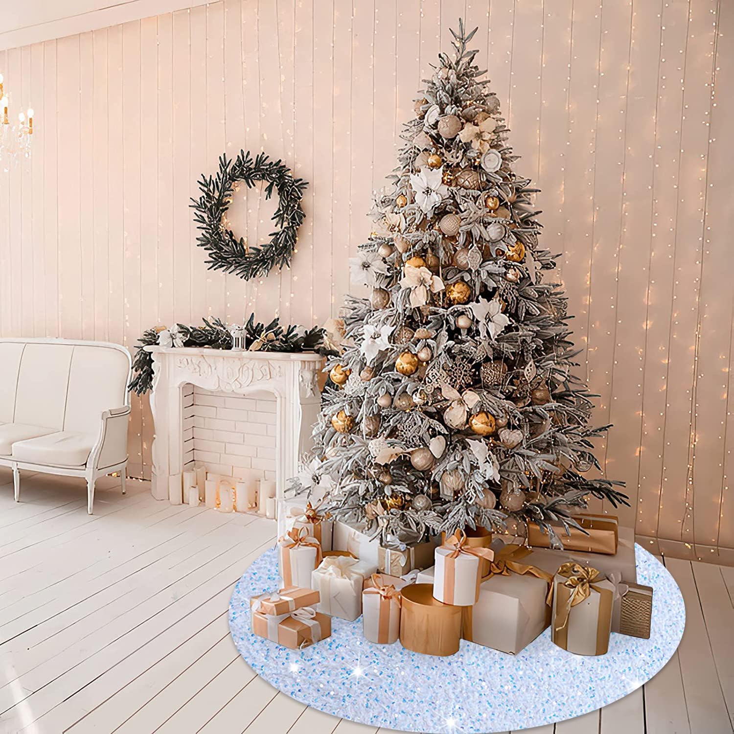 - âď¸ăSturdy Material - Sequin Christmas Tree SkirtăOur Christmas tree white skirts are made of premium 5mm sequin fabric and thick velvet material, which can show bright color at any angle. Different from the traditional sequins trees skirt, this Santa tree skirt won't fall off sequins, more elegant and shiny, adding festive fun to your home.