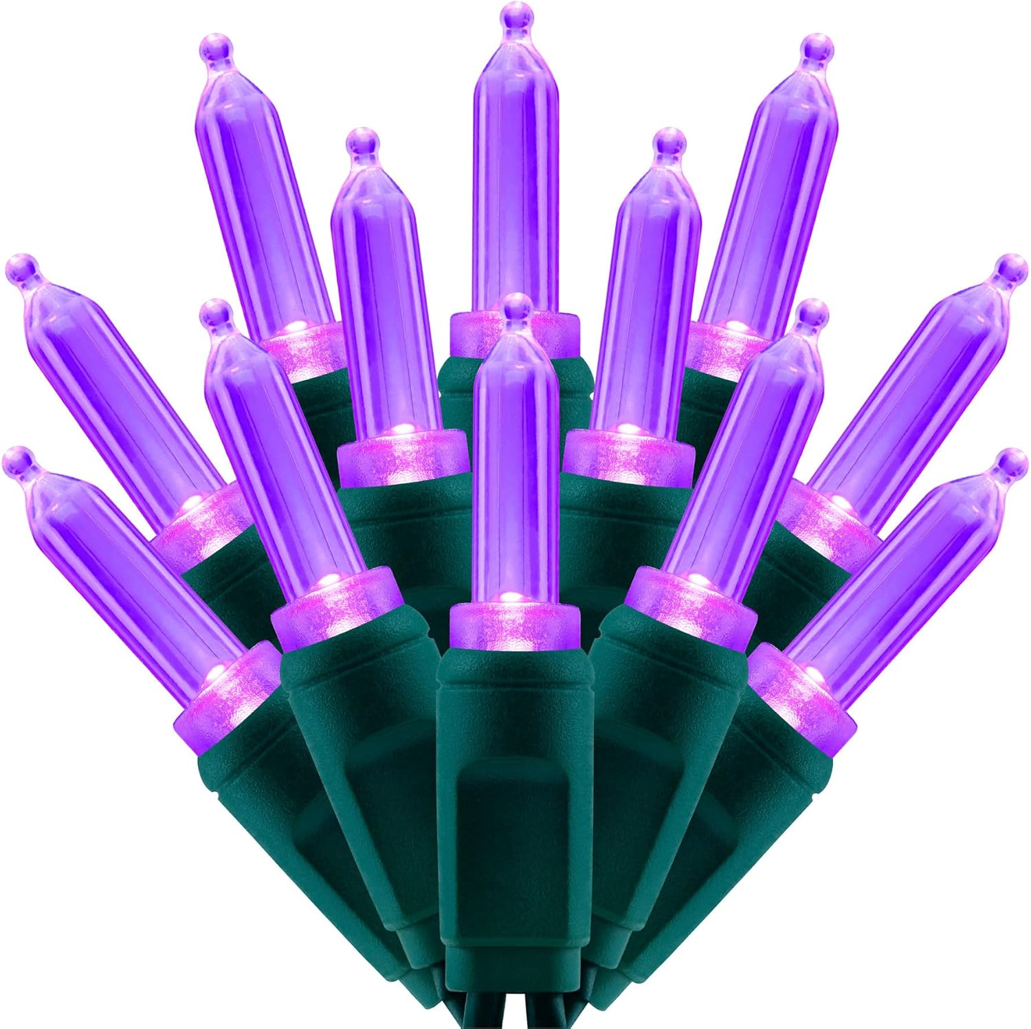- SPECIFICATIONS β Each pack contains 1 strands of one-piece string lights, total length 33 feet with 100 count purple mini lights. 22 AWG green cord, 4" lead, 4" spacing, 4" tail.